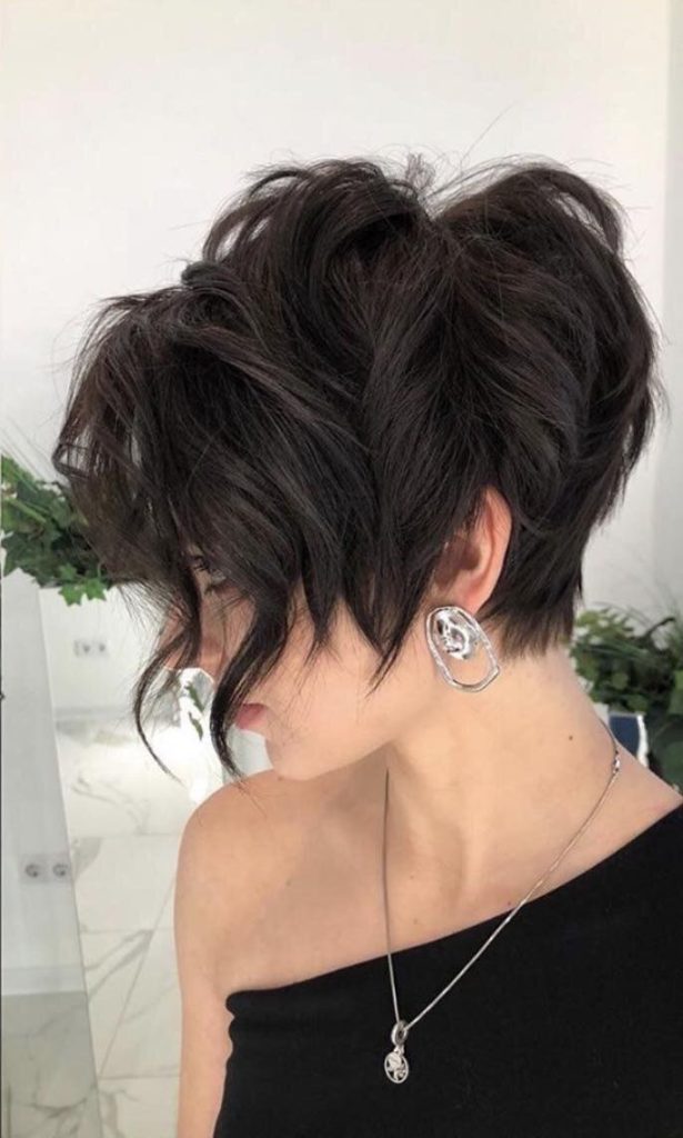 This daring chocolate pixie haircut is an out-of-the-box graphic game and features a wavy layer. The extremely short back and sides magnificently highlight the full, wavy top, which is great for the statement. This cut is a demonstration that short hair can easily be versatile and textured like any long hairstyle.