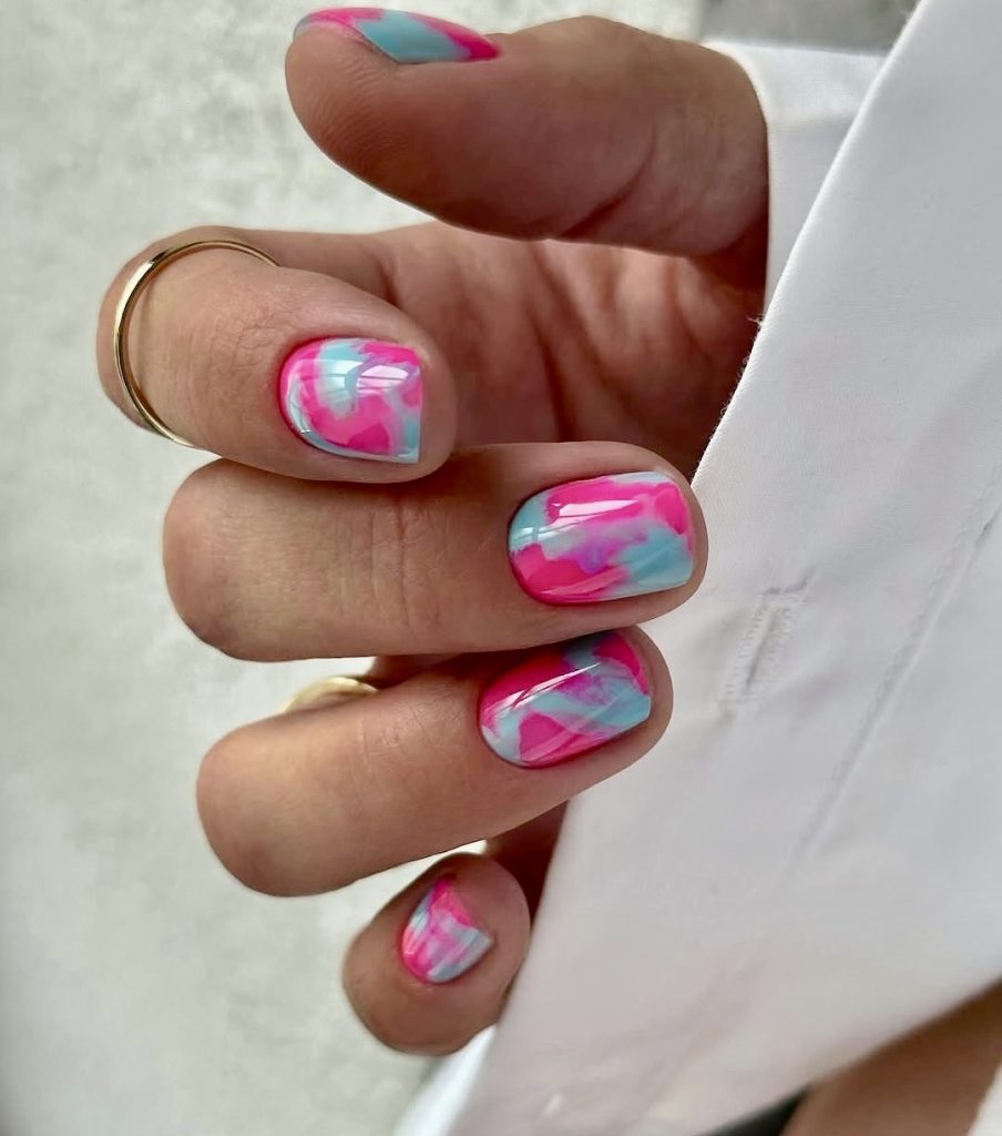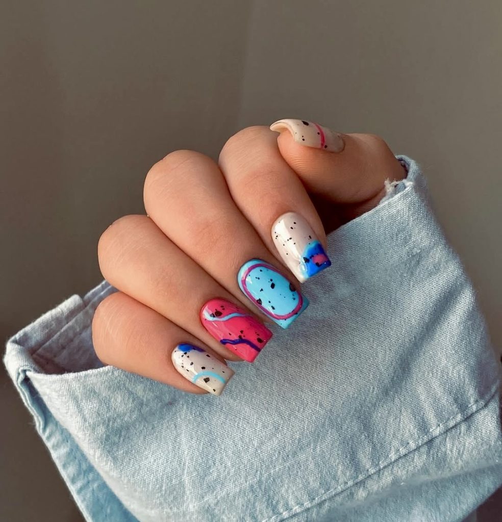 Tender but powerful, this imaginatively constructed set freeflies between pastel pink and sky blue tones in a loose free painting style. It is color combos magic of the designs in the pure state — abstract, subtle, and very dynamic. For the adherents of the short nails who desire to be artsy without being overly extravagant, this is a magnificent option. It is the perfect expression of the fresh, brave, and spontaneous spirit of the bright summer nails 2025. It is excellent for daily wear and with a simplistic bezel of gold rings and finely tailored summer looks.