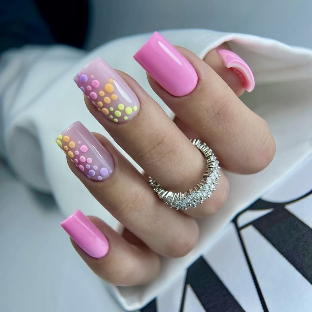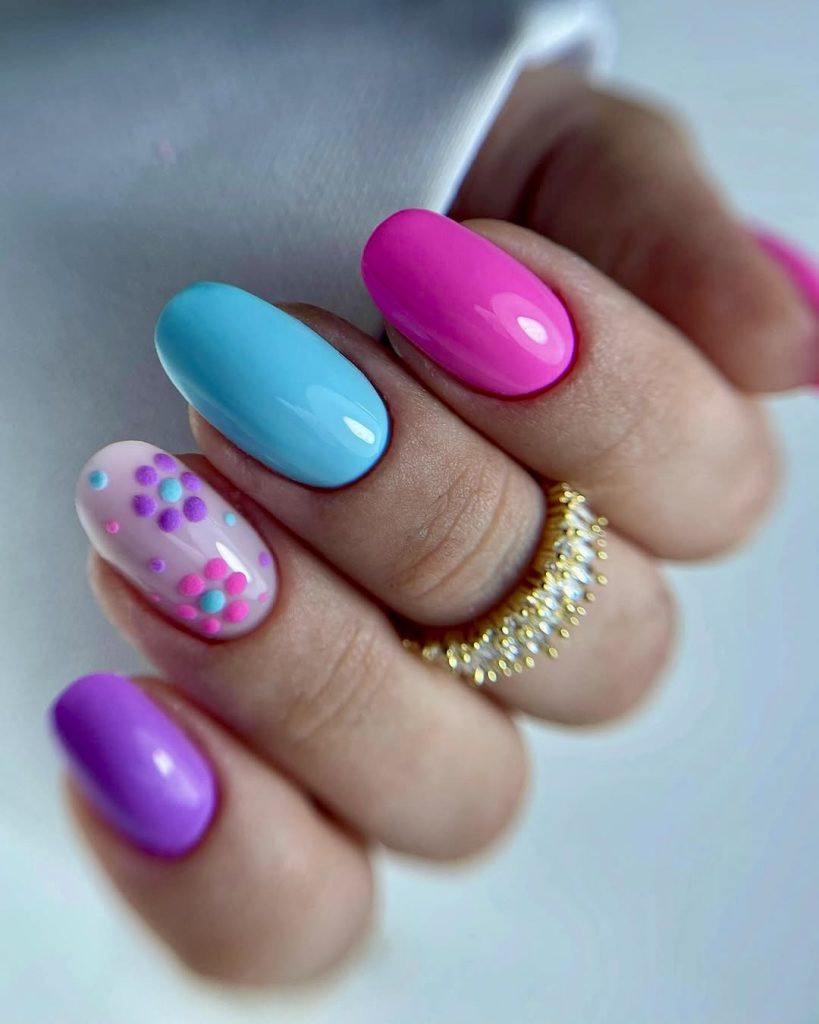 Nothing can be as great as a combination of bubblegum pink, ocean blue, and grape purple for the summer nails 2025! This set is the ultimate source of inspiration for those who love to wear bright colors as well as those who are brave to mix them. The dotted accent nail is a 3D art element that brings a whimsical touch without being overly extravagant. This design is perfect for a gel short style, both functional and attention-grabbing for your daily escapades or last-minute weekend getaways.
