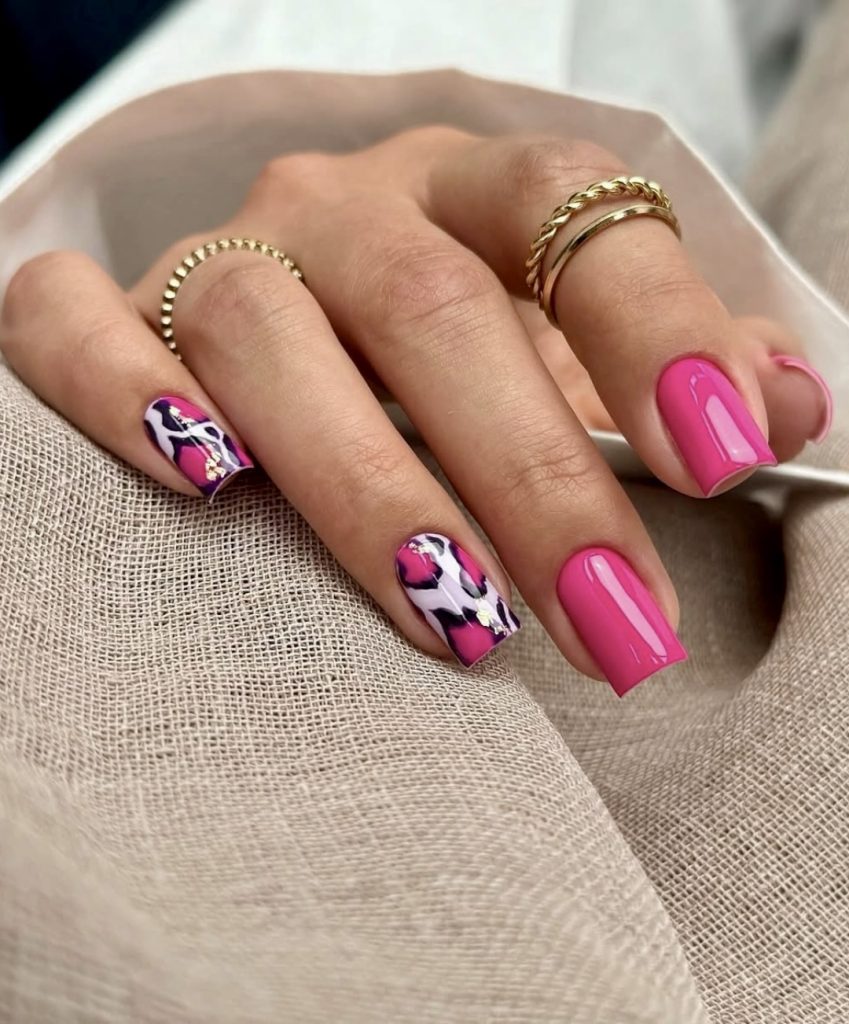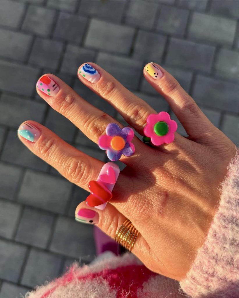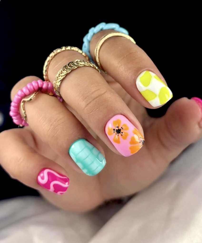 Reliving Y2K is surely making a big comeback to this set, which is colorful and covers various fresh patterns like cow spots, tiny flowers, and pink leopard print. The feeling we get from it is just fun, which is particularly suitable for women who like fashion experiments and are open to mixing colors and art. The stylish sun-bathed colors for nails 2025 in this manner of treatment are recommendable for short or gel short nail fans that want to express their quirk with ease. Additional points if you wear it with bright colored plastic rings, just like the ones in the picture, which will instantly make you a part of the retro-pop trends that are dominating this year.