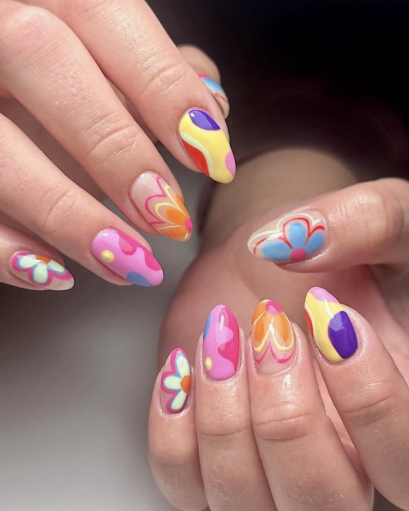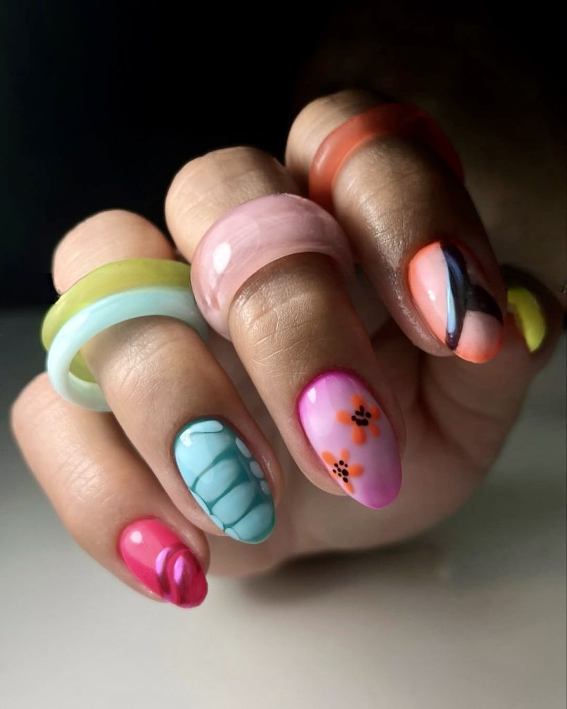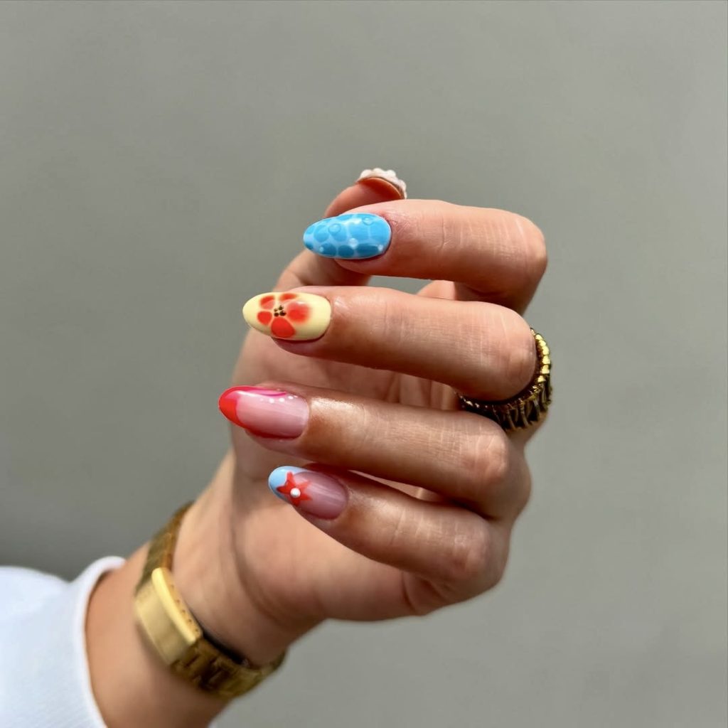 Florals are a summer staple, but this year, it’s all about bringing them into 3D. Glossy flowers in bright orange and soft blue bloom over muted backgrounds, creating a tactile, irresistible texture. The blue polka dot designs on the thumb add extra fun, tapping into a retro 70s vibe that feels incredibly on-trend for 2025. Whether you’re going short or keeping a graceful almond length, this is a dreamy inspo option. Bonus: florals always pair wonderfully with flowing skirts, puff-sleeved blouses, and strappy sandals for a carefree, stylish summer look.
