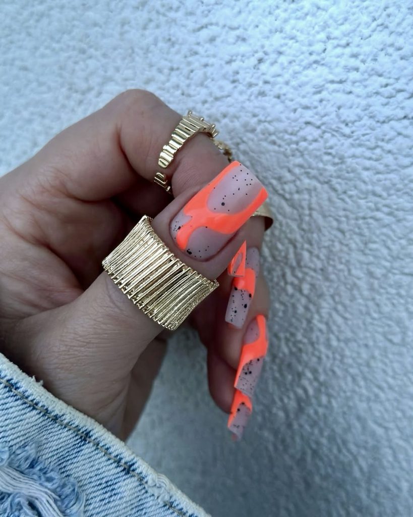 In the roster of summer nails 2025 that is trending and lively, one definitely comes to mind, which is this electric neon and multi-colored design. Vivid orange swirls are seen on the surface of the nude base, and a few tiny black flecks are also there to add some drama. The matte finish not only gives the neon colors a real make dirty idea but also forms a bright contrast, which is very much suited for daring trendsetters. This design is just fluorescent neon art — the most suitable option for sunset festivals or poolside parties. Wear this design on coffin shape or longer square nails to strengthen the futuristic style, with the addition of metallic jewelry or a destroyed denim jacket for an unobtrusive glamorous look.