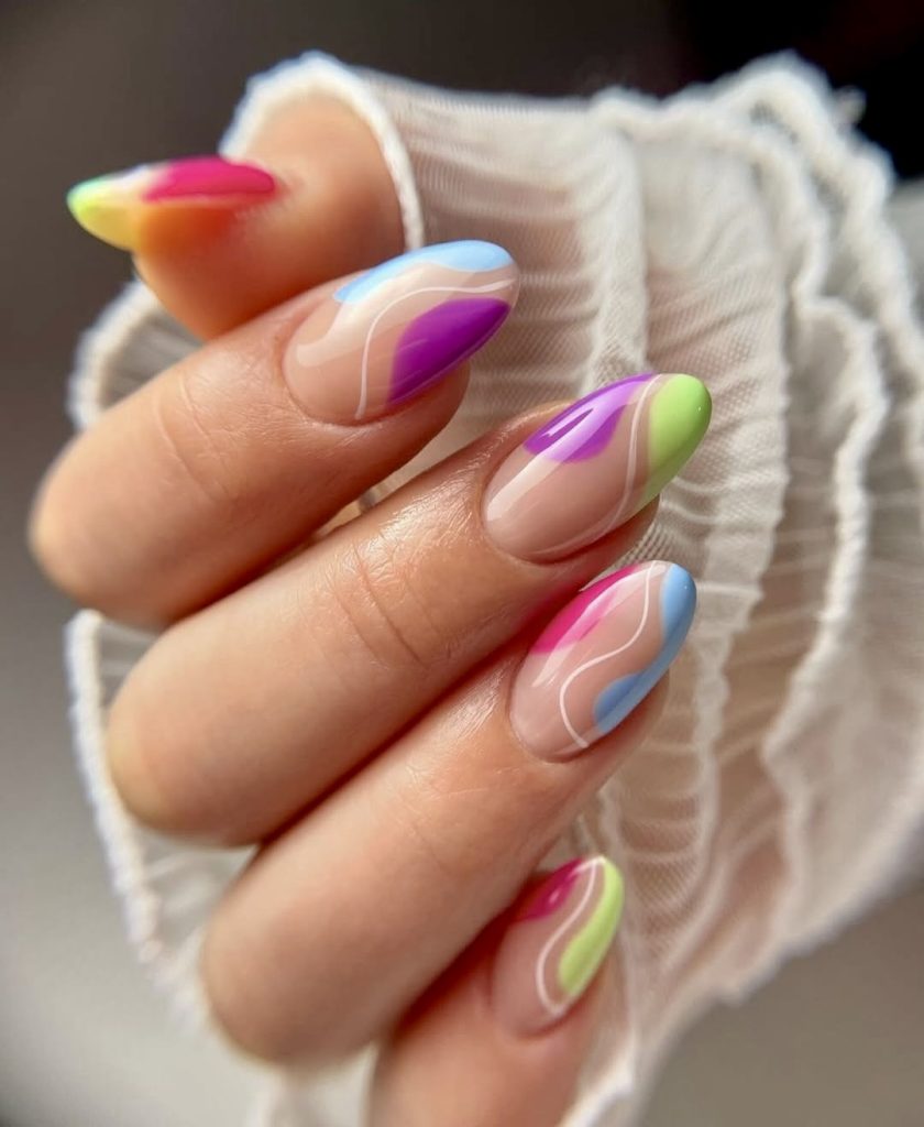 This is the most colorful summer nails 2025 inspiration for you if your personality is all in the shades of the rainbow. Vivid curves of neon pink, sky blue, lemon yellow, and lush green contrasted with the interspersed nude background brings this iconic but totally survivable style on the rainbow-riding model. Finer white lines that are barely visible introduce the detail, imparting a sophisticated look to this simple design. The shorter almond or oval shapes are the best for exact this style, which makes the wearers look more lively and carefree. Imagine the outfit with the flowing skirts, crop tops, and the oversized sunglasses for this full-on summer goddess look!