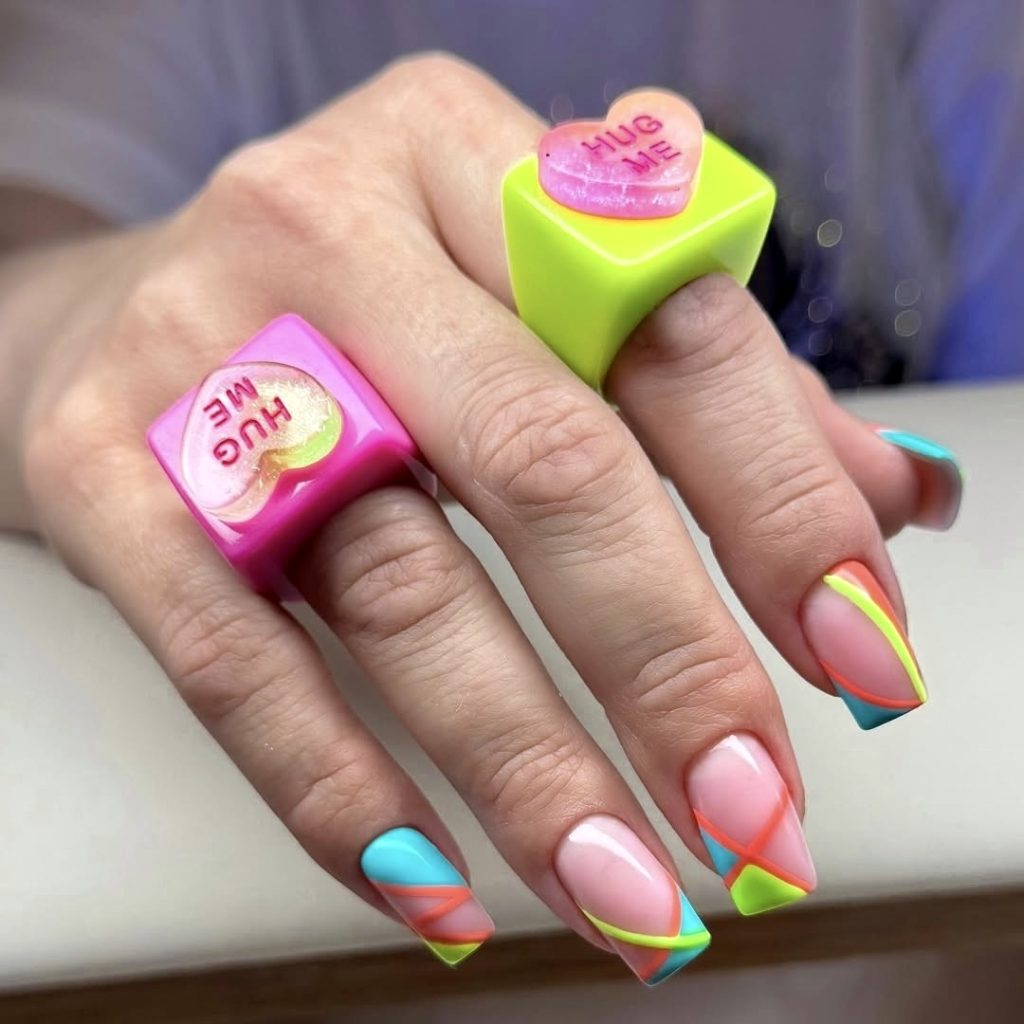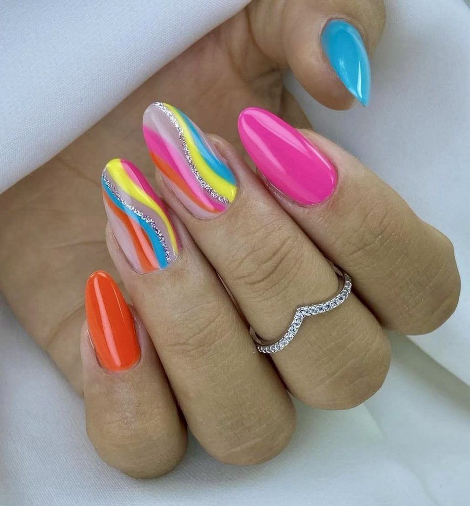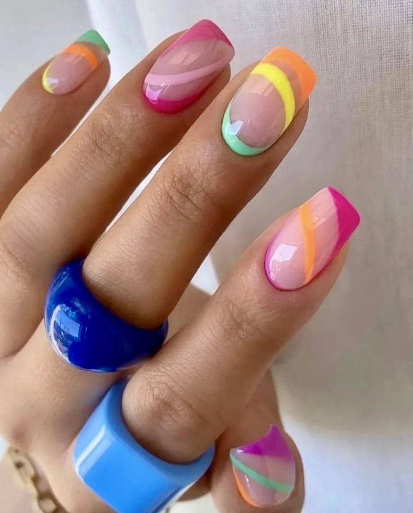 This is the set that emanates both boldness and elegance as it features the neon stripes of pink, orange, yellow, and mint on a transparent base. The closing bright highlights of glossy hints of playful colors, but the overall view remains chic and clean. This design is perfect for bright summer nails 2025 as it illustrates the ability to be highly creative along with being practical. This design is most appropriate for square or short nails, and it goes fabulously with bold rings and colorful summer outfits, thus, making it a mood-booster at once.