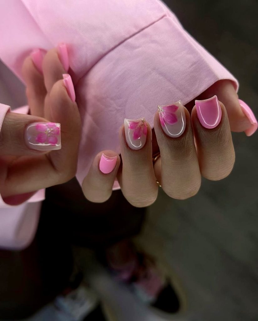 Soft, feminine, and full of grace, this bright summer nails 2025 look showcases a delicate floral art over a sheer base combined with glossy pink nails. The hand-painted blossoms look almost like watercolor art, with tiny gold accents adding just the right touch of glamour. Ideal for lovers of simple, natural, yet breathtaking designs. This style suits both square and almond shapes, giving a romantic vibe perfect for garden weddings or rooftop cocktails. Pair with pink blazers or pastel summer dresses for a look that’s timeless and effortlessly chic.