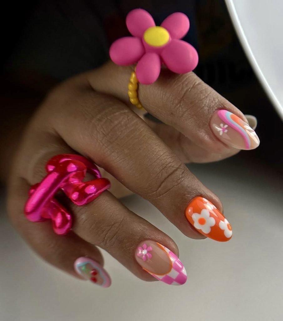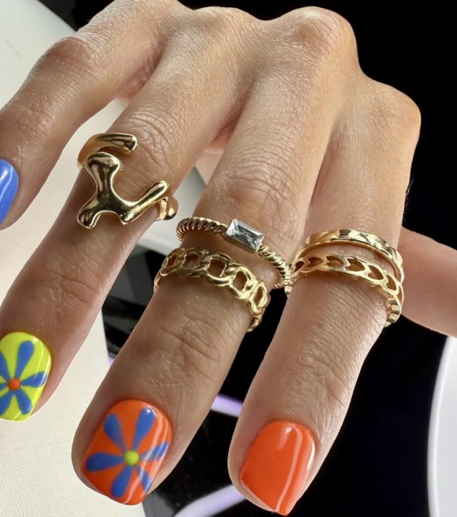 This is a lively and retro-inspired manicure with bold orange and neon yellow bases that are oversized blue flowers. Such a design will definitely attract attention for 2025, especially to those who like to make a statement. The large, and graphic floral designs are completely in harmony with square or short nails. It is the best choice for women who love to combine memories with the present mood. Pair this manicure with huge gold jewelry and color-blocked garments for an outfit looking like a summer festival that is chic.