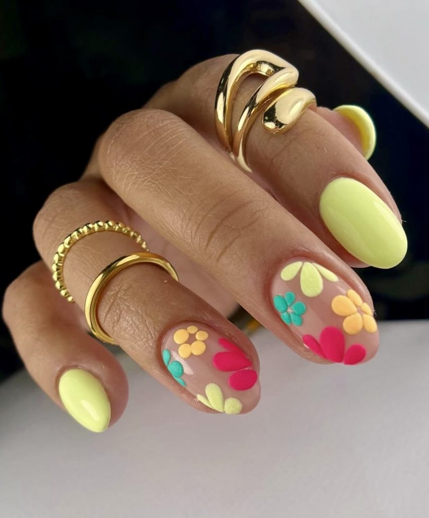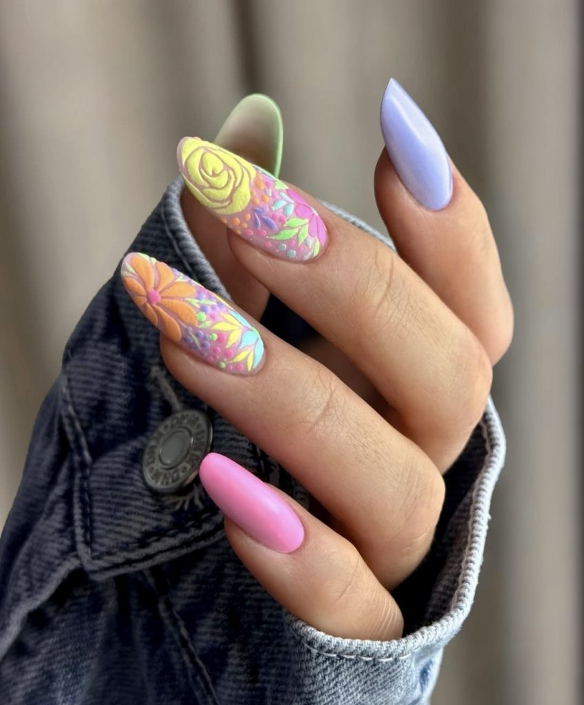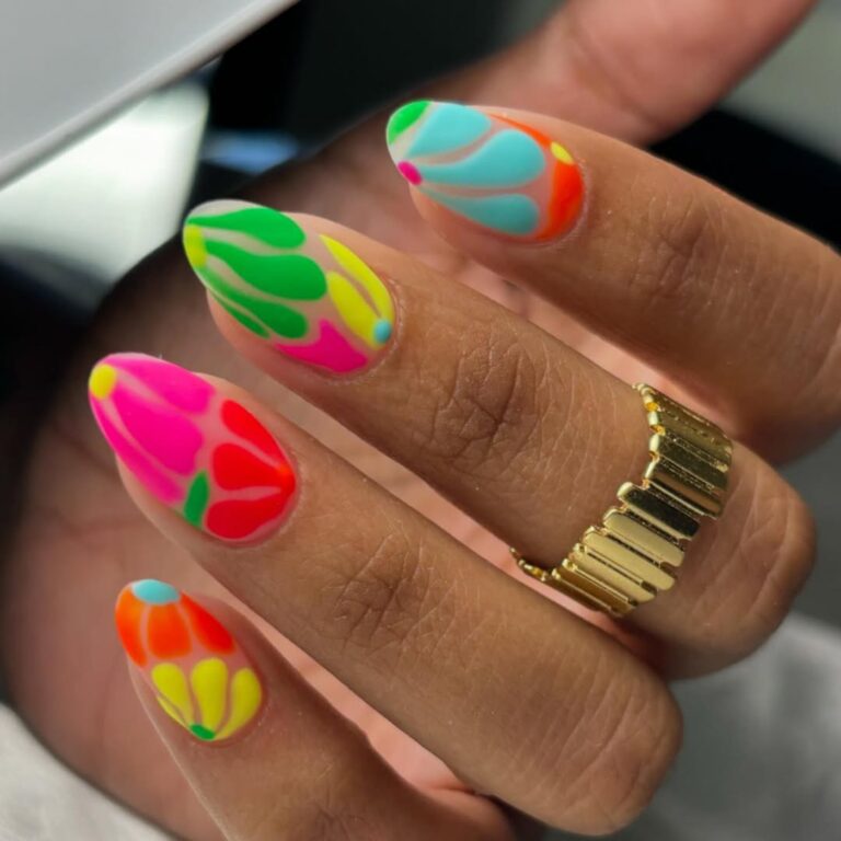 I would consider this nail art set as the epitome of creativity. These are detailed, embossed, floral patterns in neon yellow, orange, and pastel pink, that seem to spring to life on a dreamy pastel backdrop. The 3D effect gives incredible texture, making these nails look almost sculptural. Ideal for almond or elongated shapes, this art is a showstopper for special occasions. This is one of the most intricate and luxurious bright summer nails 2025 styles, which can be worn with denim jackets or airy linen dresses for a nice look contrasting each other.