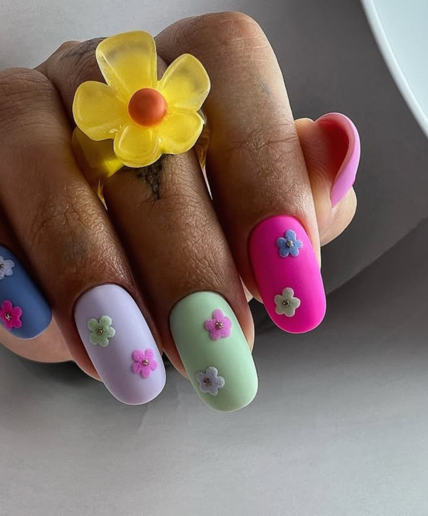 Dare pastel matte nails to get so dreamy! With the light of blue, lavender, green, and hot pink, this set of nails accompanied by the tiny, textured flowers seems to be an interpretive modern fairy tale. It has a peculiar, beautiful, and is the perfect choice for sunny bright nails 2025. Almond rounded shapes that carry the garden party vibe, while the matte finish introduces an ultra-modern update. They would look best with minimalist outfits and fine jewelry that would allow the nails to act as the protagonist.