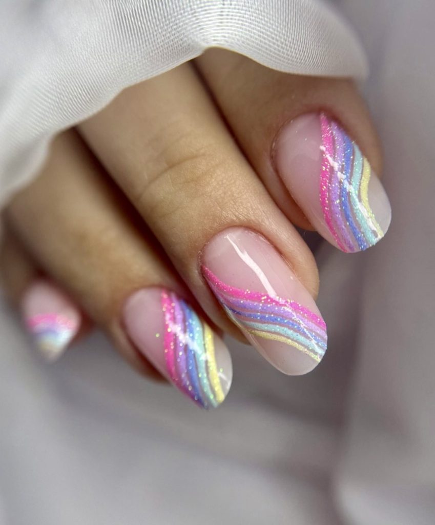 Here’s a little bit of magic from Summer: fine, shimmering stripes in pink, lilac, blue, and lemon yellow streak across a nude sheer base. Always a mix of playfulness and elegance, these bright summer nails 2025 designs are all about the light and joy. The designs are suitable for gel short nails with an oval shape, and they also match perfectly with light, airy fabrics and minimalistic gold jewelry. Surely, a cool and cute idea for a beach trip.