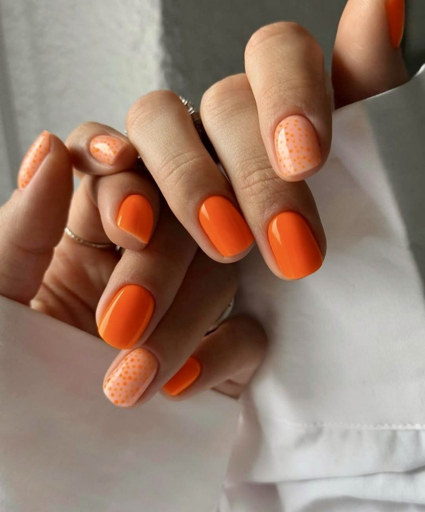 When it comes to your nails, you can never go wrong with this bright tangerine design that will remind everyone of the sun. Bright orange colors lead the way, while a few dotted embellishments add a playful touch. Add these uncomplicated yet vivid art forms to your short or very slightly rounded square tip nails, and have a clean kind with fresh summer feeling. Match them casually with denim, a white dress, or a bright bag and wear it in the spirit of 2025!