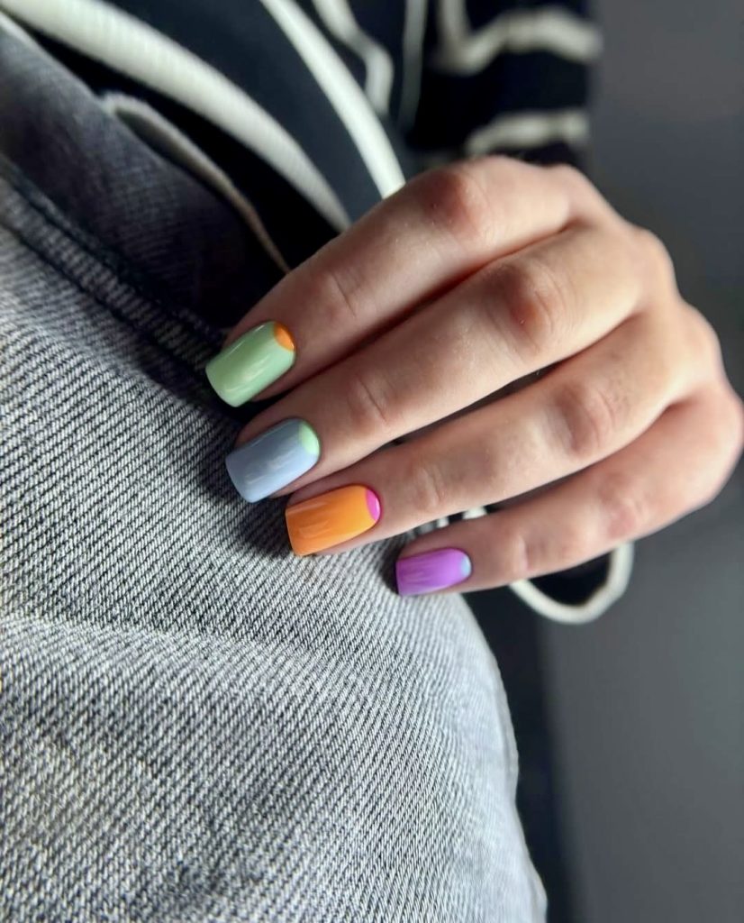 This happy interpretation of the French manicure is really a symbol of summer and nothing else can compare to it. Lightly natural nails are enriched by the addition of a lighthearted, candy-shaped tip – pink, yellow, blue, and purple are the colors you are going to see – thus forming an active and yet sumptuous vibe. The fragile art of the combination of the colors makes it possible to wear such a charming look in the daytime brunch or hanging out at the beach during the sunset. If you are the one who loves a simple but impressive design, this one is for you. It does not matter that it is a trendy almond shape or a square shape – this design is beautiful and very current for the ones who want to have interesting but cute nails in 2025. A good styling suggestion is to wear minimum gold rings so that the spotlight is on your hands.
