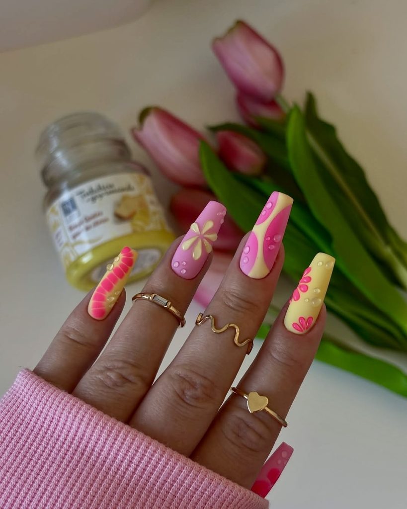 Pink and yellow are the fun ultimate summer couple, and this combo is the best example of them with tents, floral art, and bubbly textures. Along with big blossoms and funny lines, this is the most upbeat motif of the new collection 2025. Abnormal is the most suitable long coffin shape or square nails to wear this design so that it takes maximal space of the pattern. Finish the look with cute crop tops, pastel sandals, and bright sunny smiles for the complete candy-colored summer fantasy.
