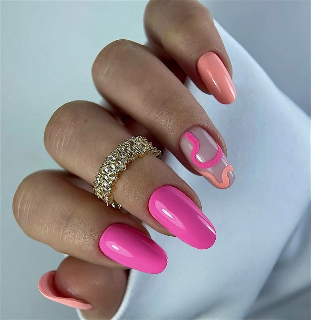 This is a simple and unbelievable idea that if you are struggling to find it is zero risk. The glossy neon pink and the soft peach used on different fingers together is a totally fun approach to one of the trend colors this season. The main feature is? The curvy accent nail with a water-clear background and the same lines that depict the movement of summer waves. It can serve as the ideal choice for those wanting neutrals with a touch of brightness while remaining understated.