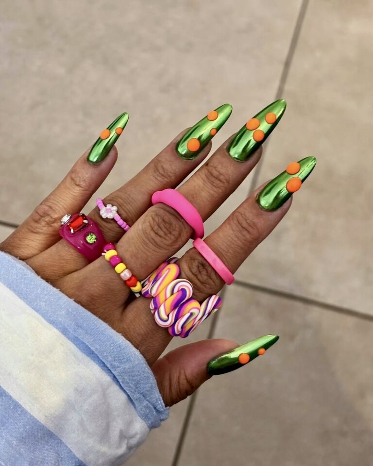 This chrome is not the typical silver you’d see — with a sleek snake accent, these pointed nails are now unlike any other. With a futuristic design and a touch of danger, this manicure exudes a lot of confidence.