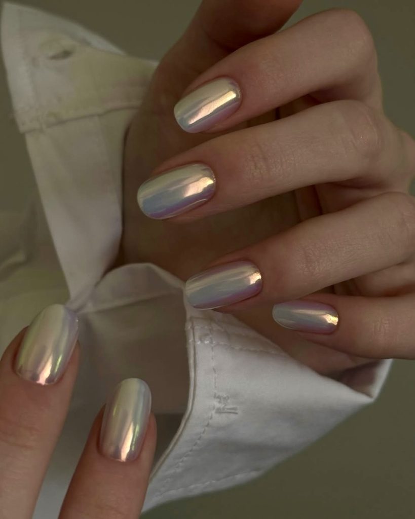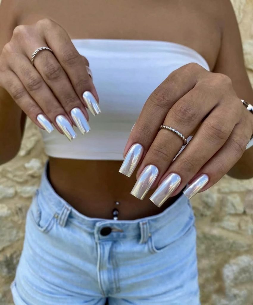 There’s a special feel to chrome nails this year. Perhaps it’s because they shine in many ways like tiny mirrors or because instantly they brighten your nails and give your hands a clean look. Chrome nails are trending in soft pearl, vivid silver or pastel shades, so you’re sure to find something you like — just be sure to want your beauty strong yet simple.