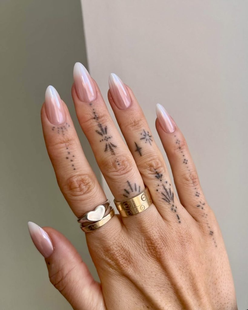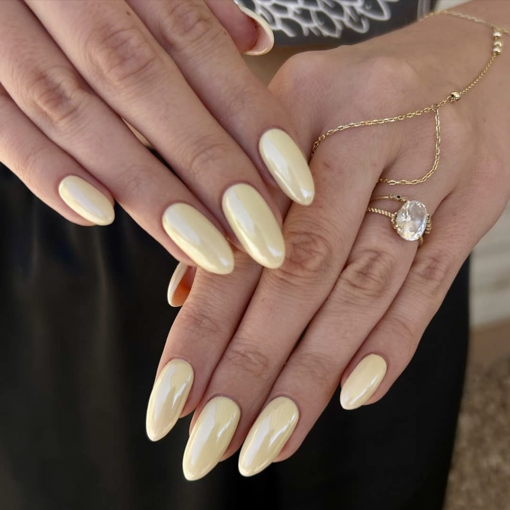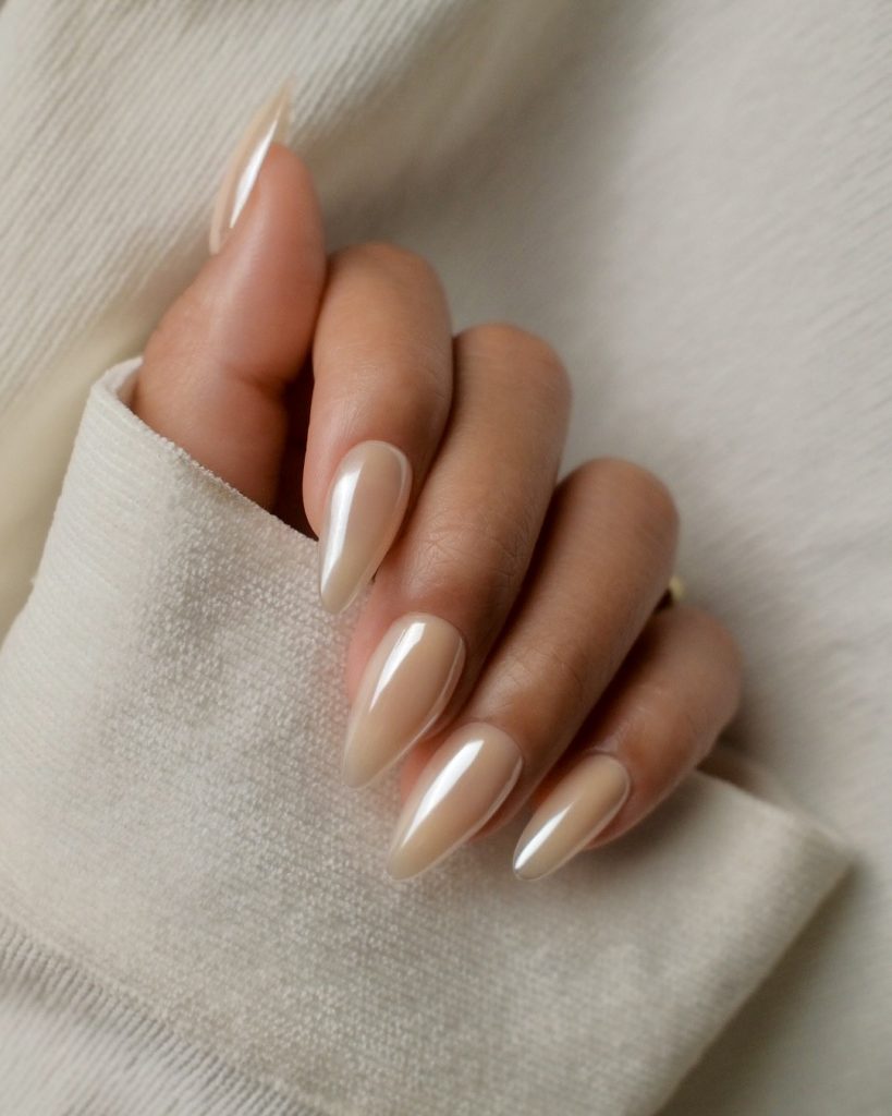 Looking rather perfect on medium-sized almond nails, it brings balance to outfits and highlights tanned or older hands. Bonus? You don’t need to go to great lengths to take care of them. Just smooth, subtle shine.