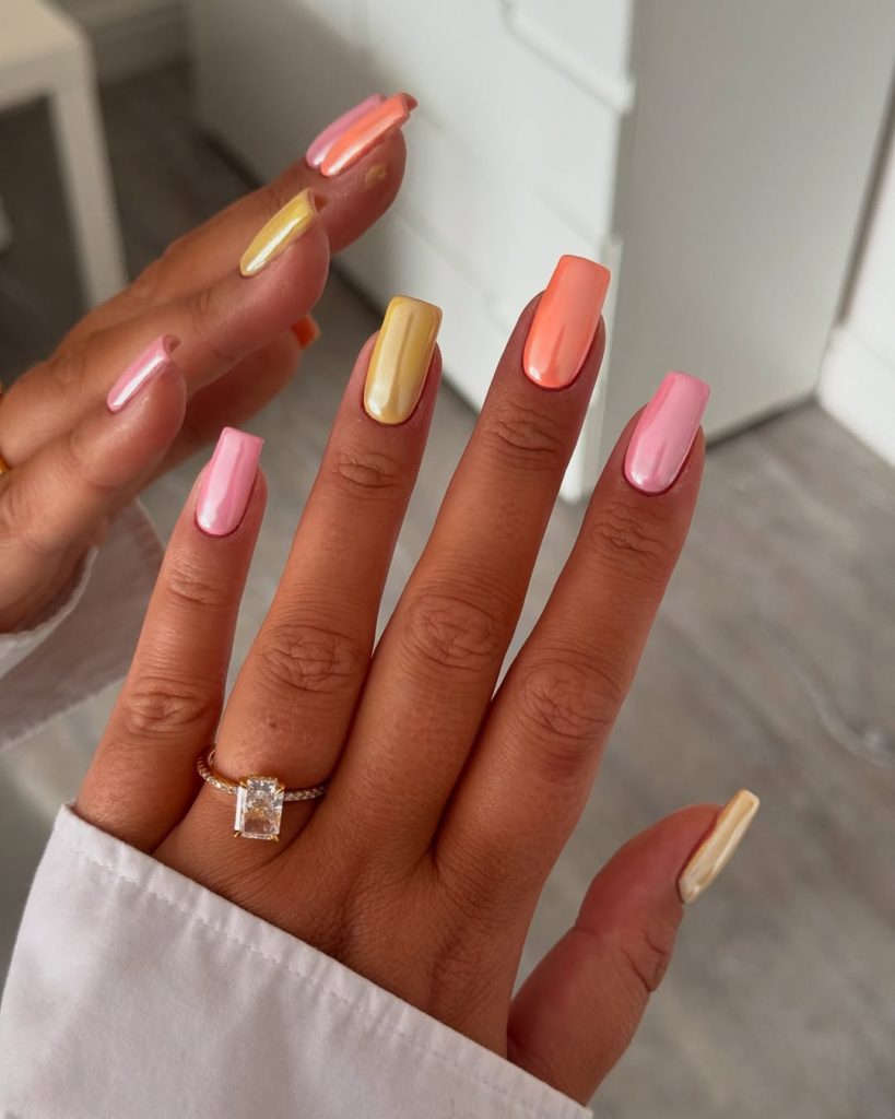 This multi-colored chrome mani glows with fun and is almost too sugary sweet. Pink, yellow, peach and coral make it appear as if summer is packed into every swipe. The gloss finishes give it a lovely shine that looks childlike and very stylish at the same time.