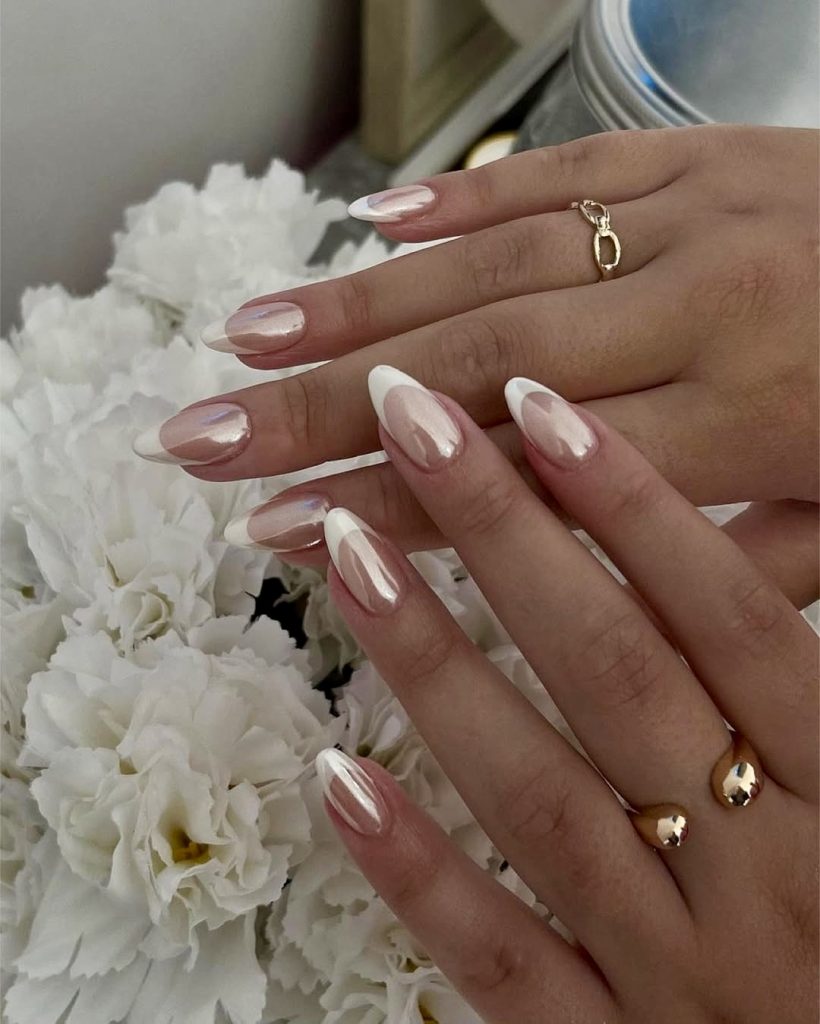 The updated version of a french tip manicure looks both classic and a bit daring. A pearl chrome color gives the design a look toward the future and the strong white tips ensure it reflects tradition. It has bridal hints, there’s some glam, plus it feels very fresh for 2025.