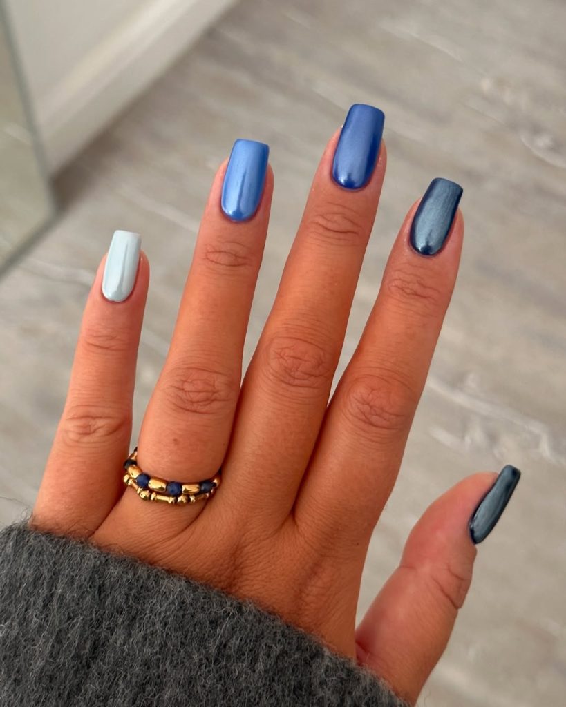 This color change, from soft to dark navy blue, reminds me of the sea and after-dark glamour. Every nail is finished in chrome and reflects blue and navy, so your fingers keep changing the look.