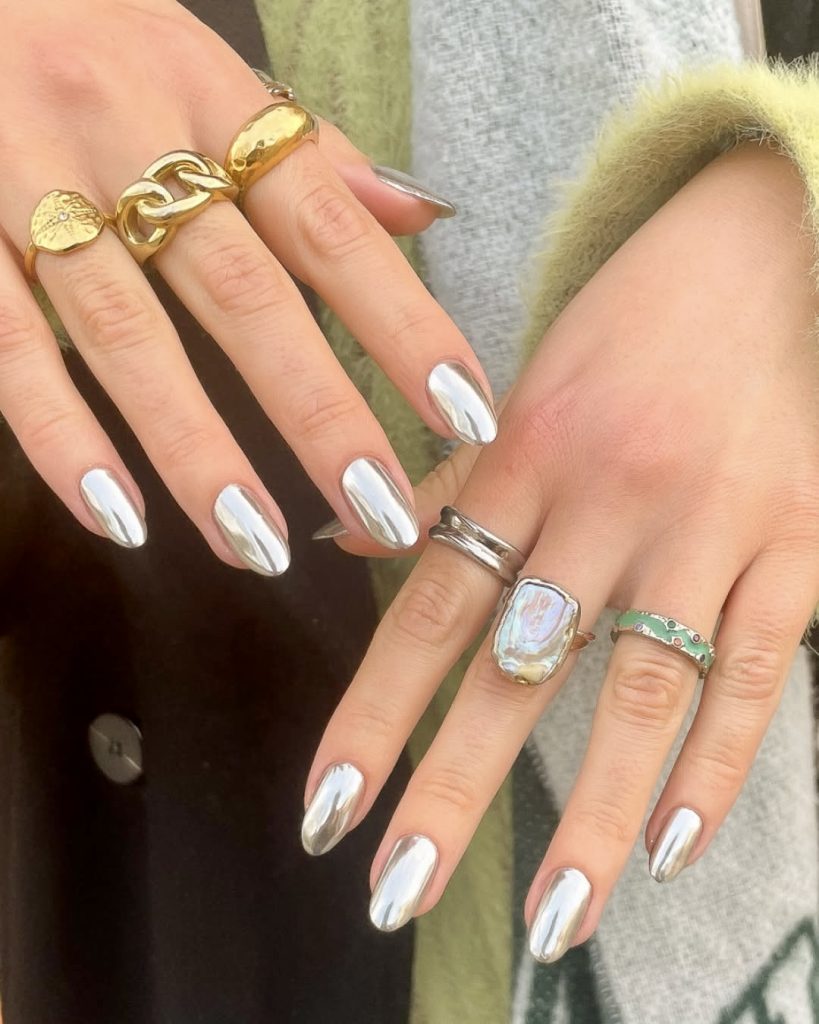 These chrome nails prove that you don’t have to go bold to make your look interesting. Because the nail base is a ‘pink’ shade, it shines just enough for a fun style and the rounded tips help it appear accessible. It’s the “clean girl” aesthetic, with a high-shine upgrade.