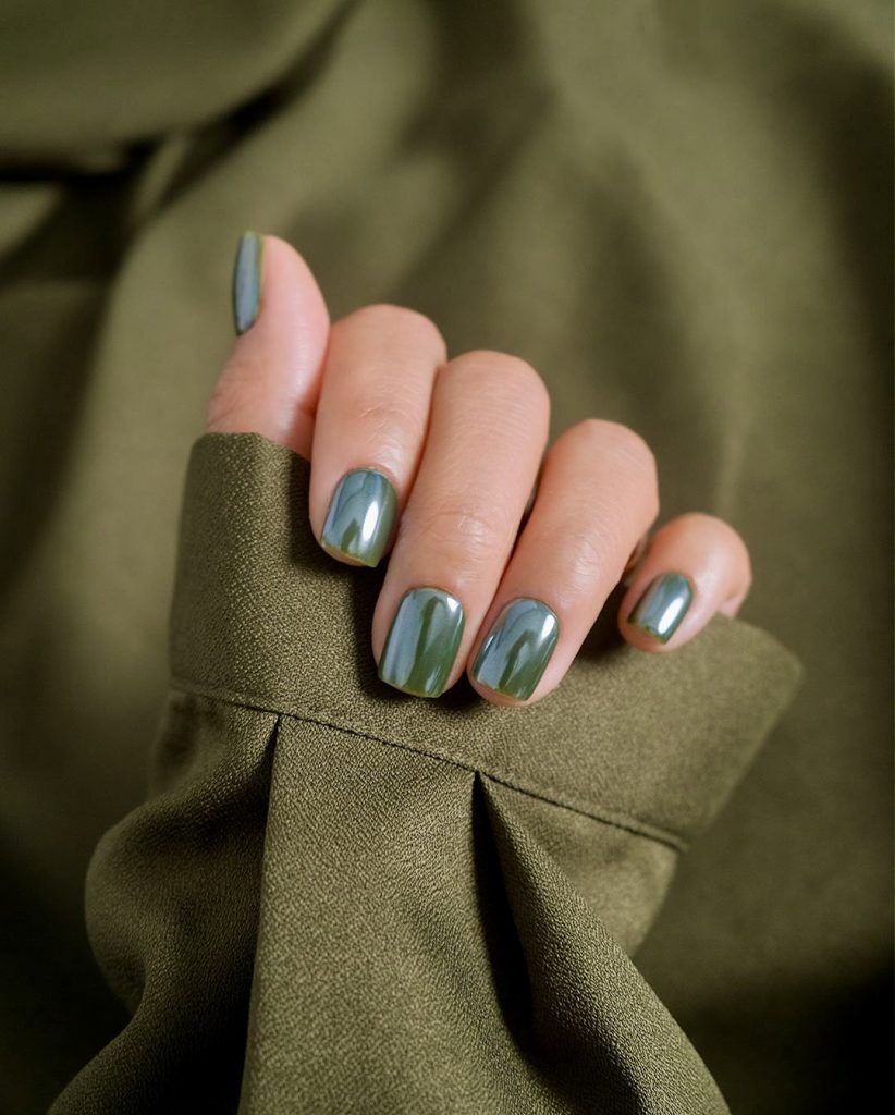 Not what you would expect, but absolutely irresistible, green chrome is the trendy girl’s go-to instead of neutrals. A soft metal gloss appears with movement, so these perfectly round nails feel bold yet elegant. Think army jacket meets high-fashion.