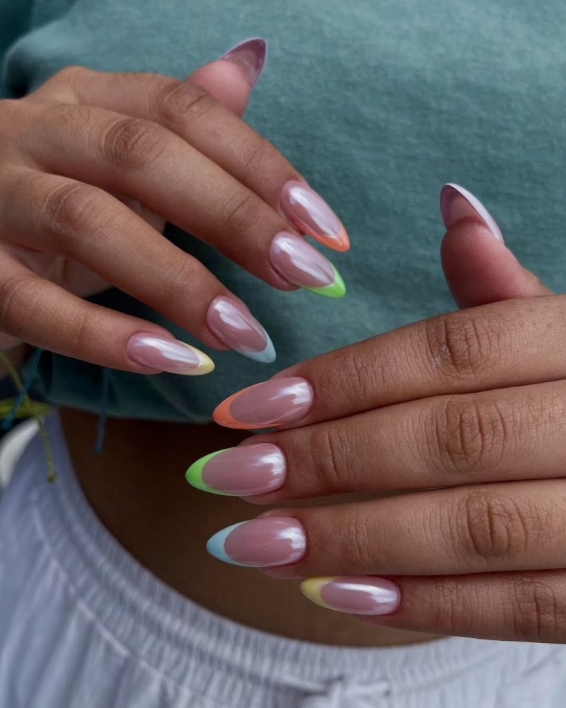 It’s much like enjoying a fruit sorbet sampler, with a chrome base and pops of vibrant colors on each end. Every nail is different, from teal to pink, lime and lavender, yet every single nail looks like it is part of the same set.