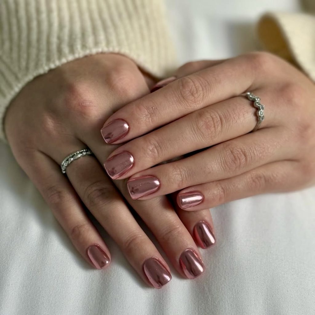 Rose gold chrome looks sophisticated because it’s warm, rich and romantic at the same time. The smooth and polished short, rounded nails have a shiny reflection that looks both graceful and never tries to impress.