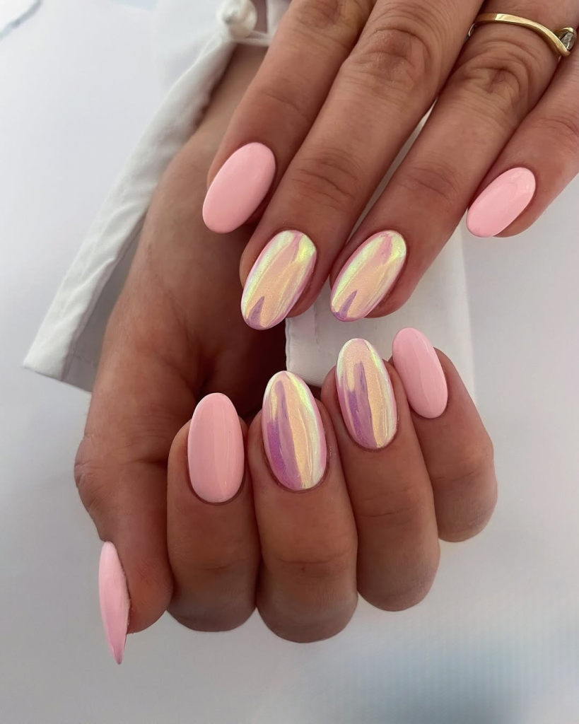 This look seems like a romantic sunset has been made into a chrome dream, with waves of pink, blue and lavender looking like an iridescent swirl together. It’s feminine, bold, and just a little hypnotic. A total conversation starter with a dreamy twist.