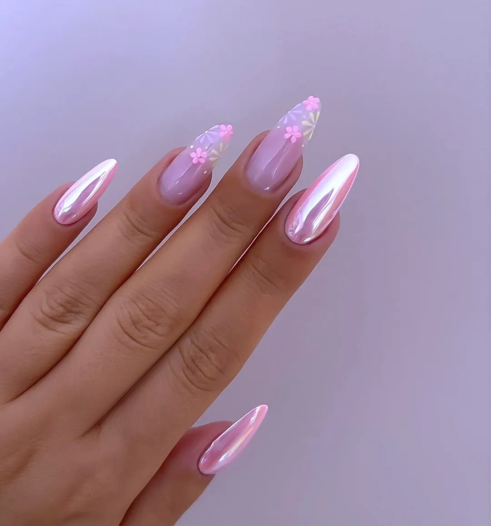 There’s nothing quite like pink chrome with small, pretty flowers in the spring. Its sweet and feminine style also has a romantic touch, as it reflect sunlight like morning dew. The pretty flowers in the middle of the nails are nicely matched by the polished finish on the outer nails.