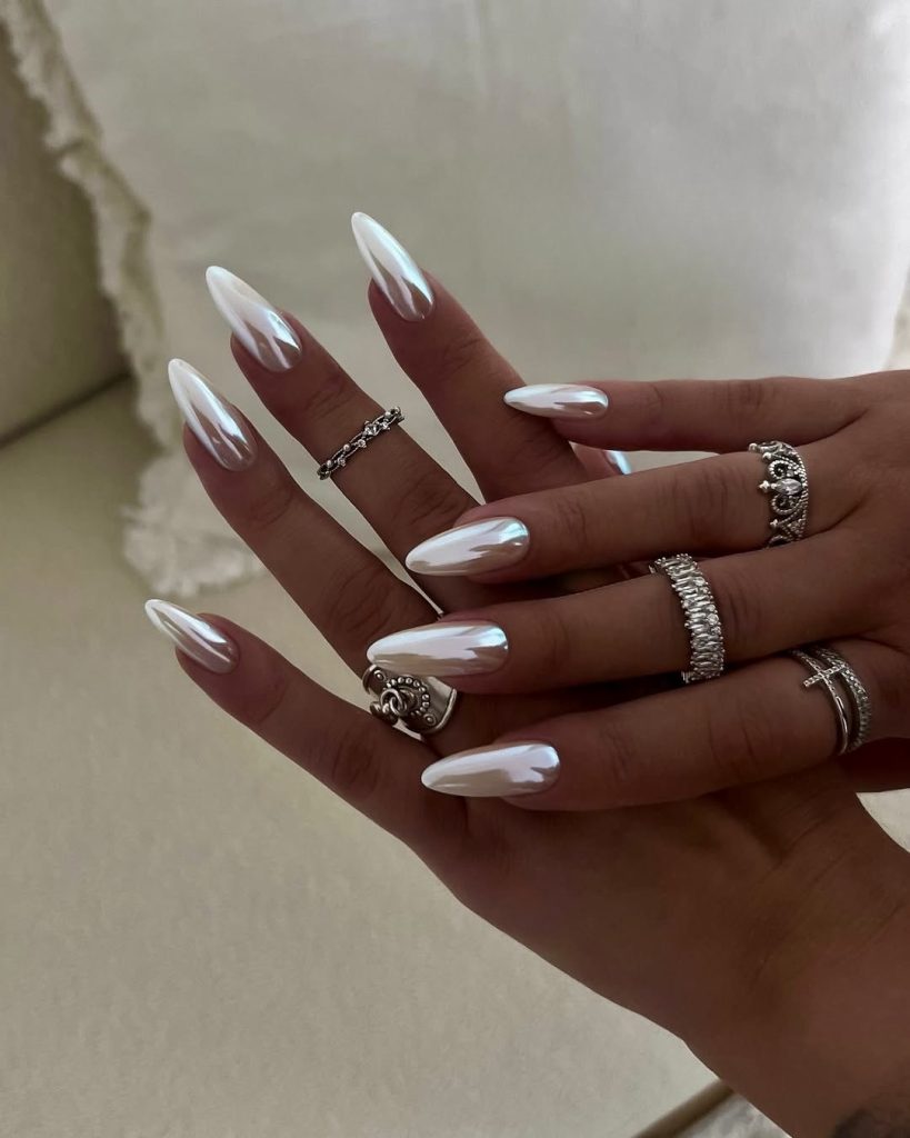 These white chrome nails are very bright, just like fresh snow and give off a mysterious glow that’s almost magical. Crisp, neat and luminous, they give a fresh interpretation to bridal whites or winter-style elegance.