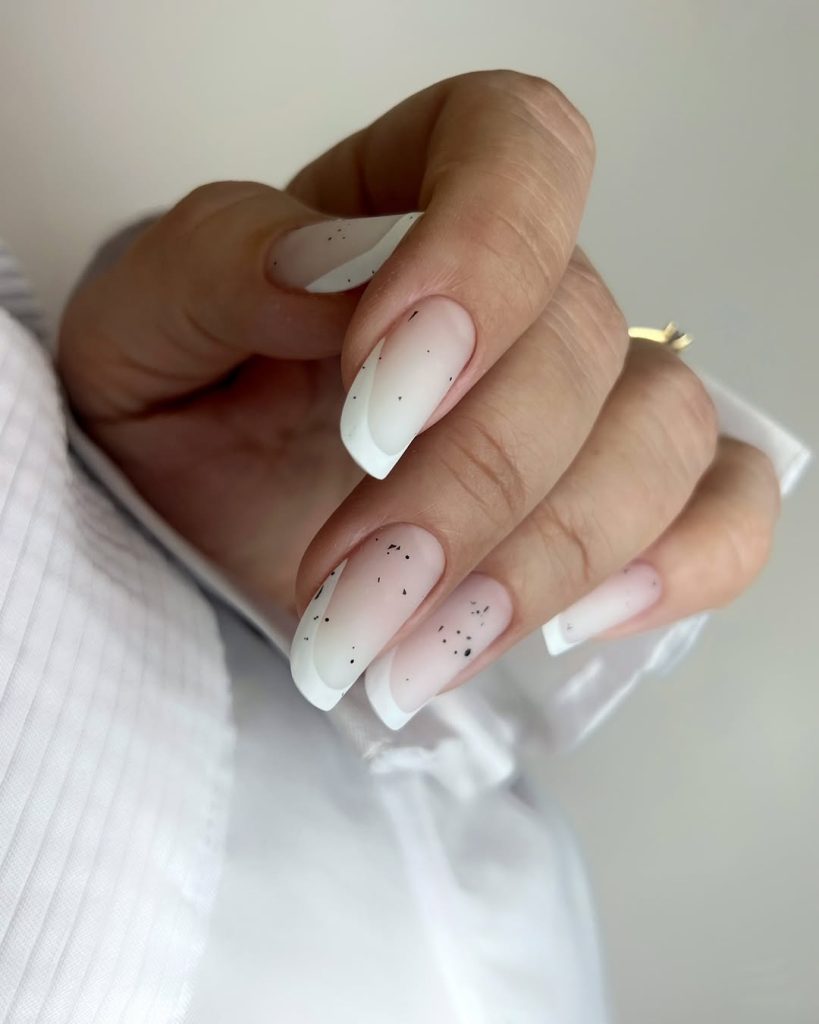 Understated doesn’t have to mean boring. Add such speckled milky nails and make your french manicure a bit whimsical. The white tips are purely contemporary and cuddle-like, a touch of cloud on the blue sky. Small black spots, which are randomly sprinkled on the top of the creamy layer, introduce a tinge of art-like exclusivity – very discreetly, yet so trendy.