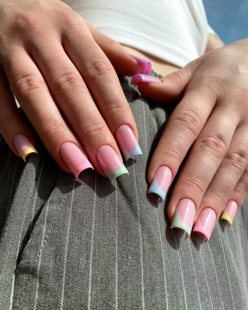 This style works perfectly with short to medium length square nails, making it a good compromise between childish and adult-like. It perfectly fits the needs of people, who require colored french ideas 2025 with some personality. Also, they work wonderfully with all kinds of things including denim jackets and linen dresses.