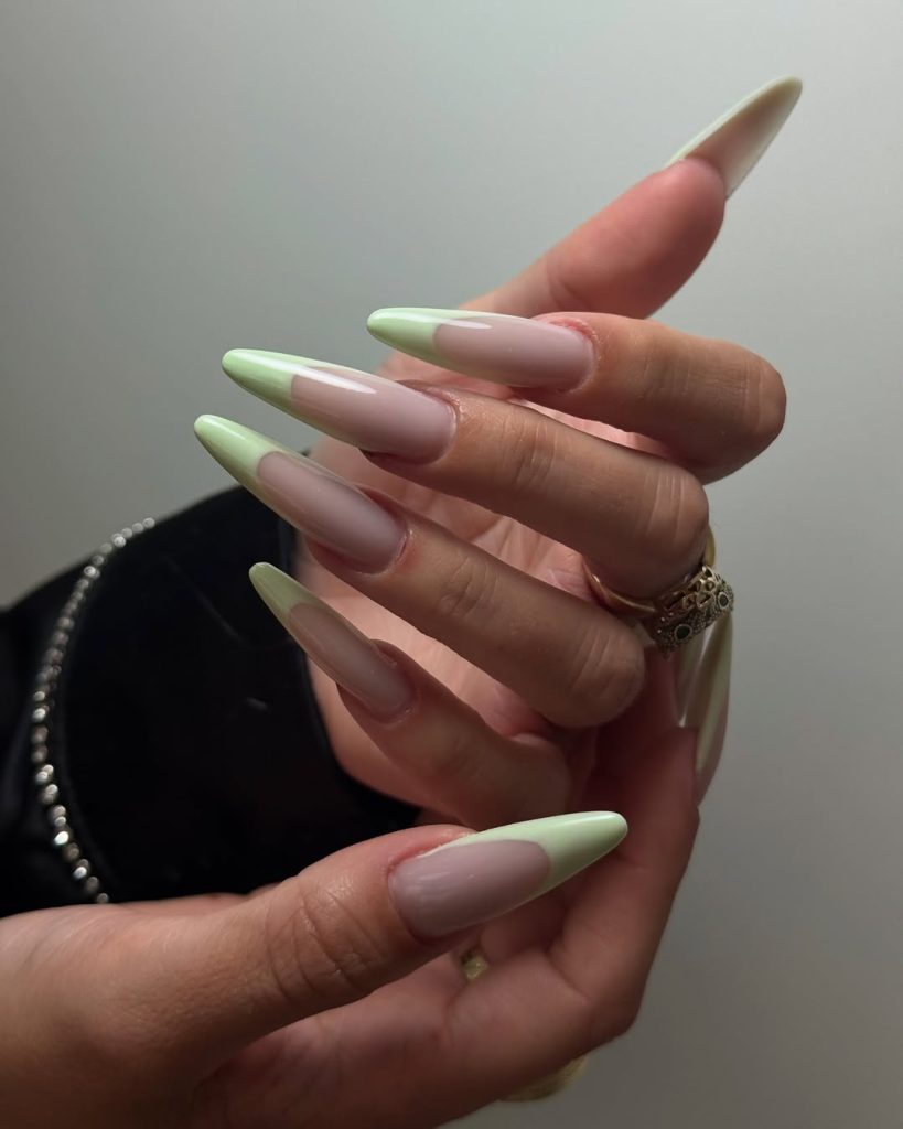 These airy almond nails get a new twist with the addition of pistachio green towards the end of the nail to give the vibe of being cool and calming. The base is sheer pink, which is goth enough to keep the shade lightly gothic, whereas the pointed shape gives it a dramatic touch. It’s like a botanical garden and a fashion runway collided — soft, chic, and a little unexpected.