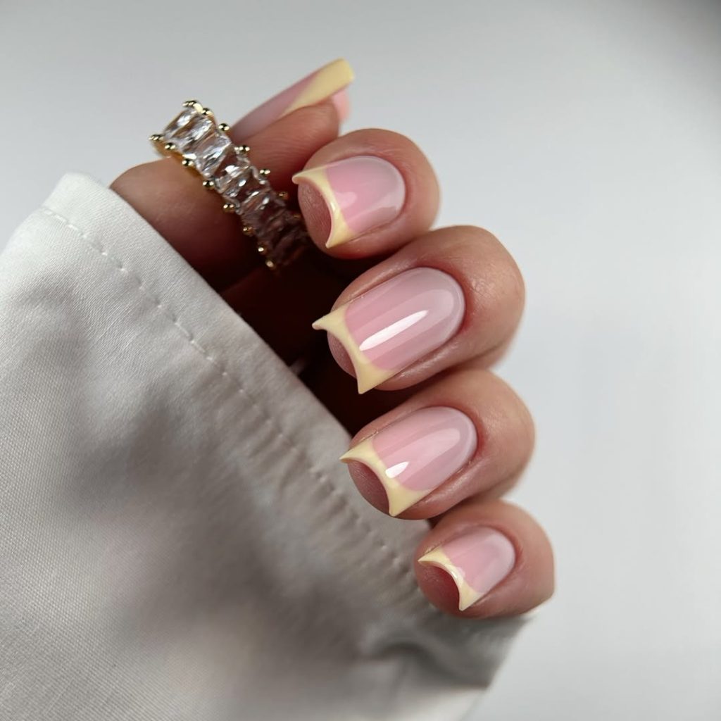These are roundier french shapes with new life added to them by these curved buttercup yellow tips that add a fresh optimistic energy. The tips are soft and curve in a way that gives the semblance of petals being placed around your nails, and the result is a soft, feminine touch. It sounds spring like and cheery like, going through a field of wildflowers in the sun.