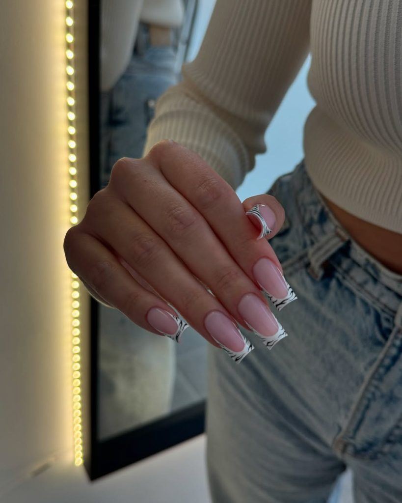 So graffiti-style, these French tips come in a zebra pattern that has a sheer pink background so that the pattern is more of the focus than it is the base. It is bold, whimsical, and trendy, kind of animal print without actually having animal print. This has a cool-girl quality to it when combined with leather or denim.
