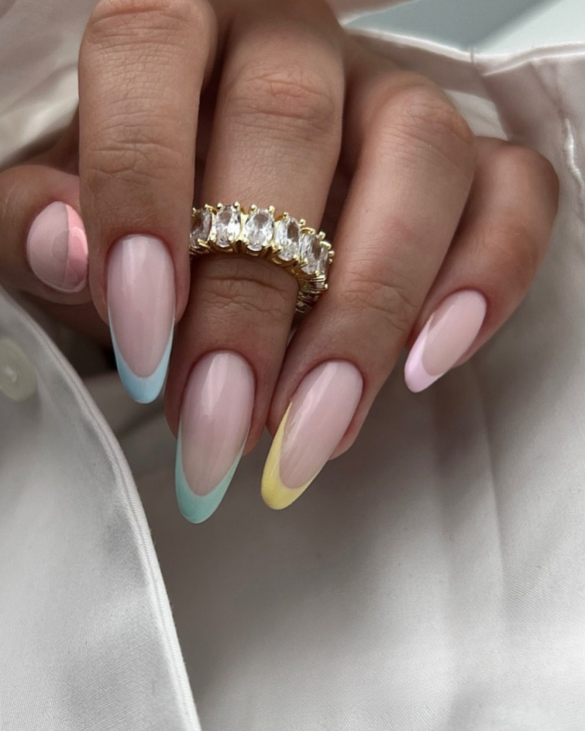 Light as air and as a spring morning, this pastel french manicure brings together the colours of baby pink, yellow, blue, and lilac. The gentle almond silhouette maximizes the movement of each curved tip to bring a cotton candy color palette punch that is demanded elegance but not too childlike. It’s peaceful, polished, and full of gentle charm.