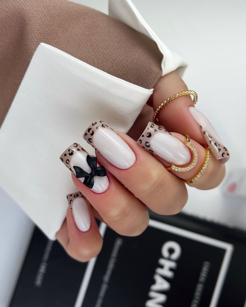 Neither precise nor very conservative, this ultra-feminine appearance gives a fierce twist to sweet detail. Leopard print nails are combined with frosty white color and finished with a teeny black bow on the odd nail. It is kitschy, glamorous, and completely trendy fashion forward, such as matching high heels with a satin bow blouse.
