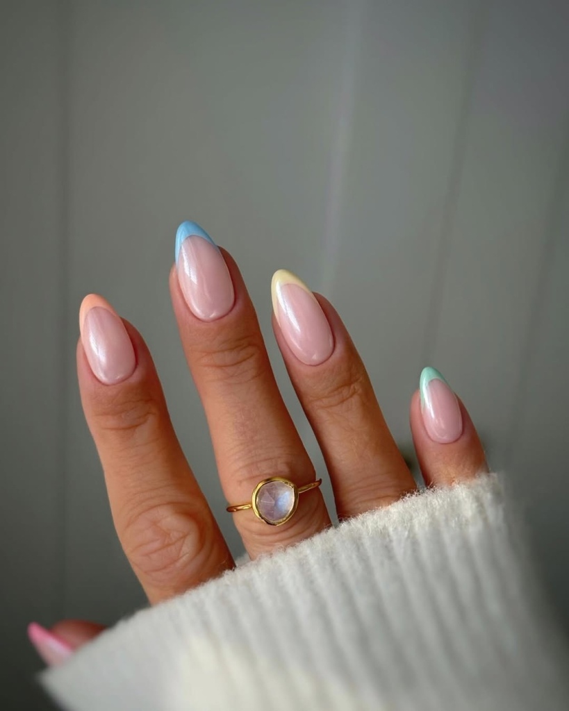 This style really accentuates Almond shaped ones, and suits the vast majority of the length of the fingers, with a youthful flare. If you’re searching for colored french nail ideas 2025 that feel both chic and cheerful, this combo is low-fuss and high-impact. It would be wearable on all skin undertones because the base has an iridescent finish that makes it look beautiful on everyone, and the colors make it interesting.