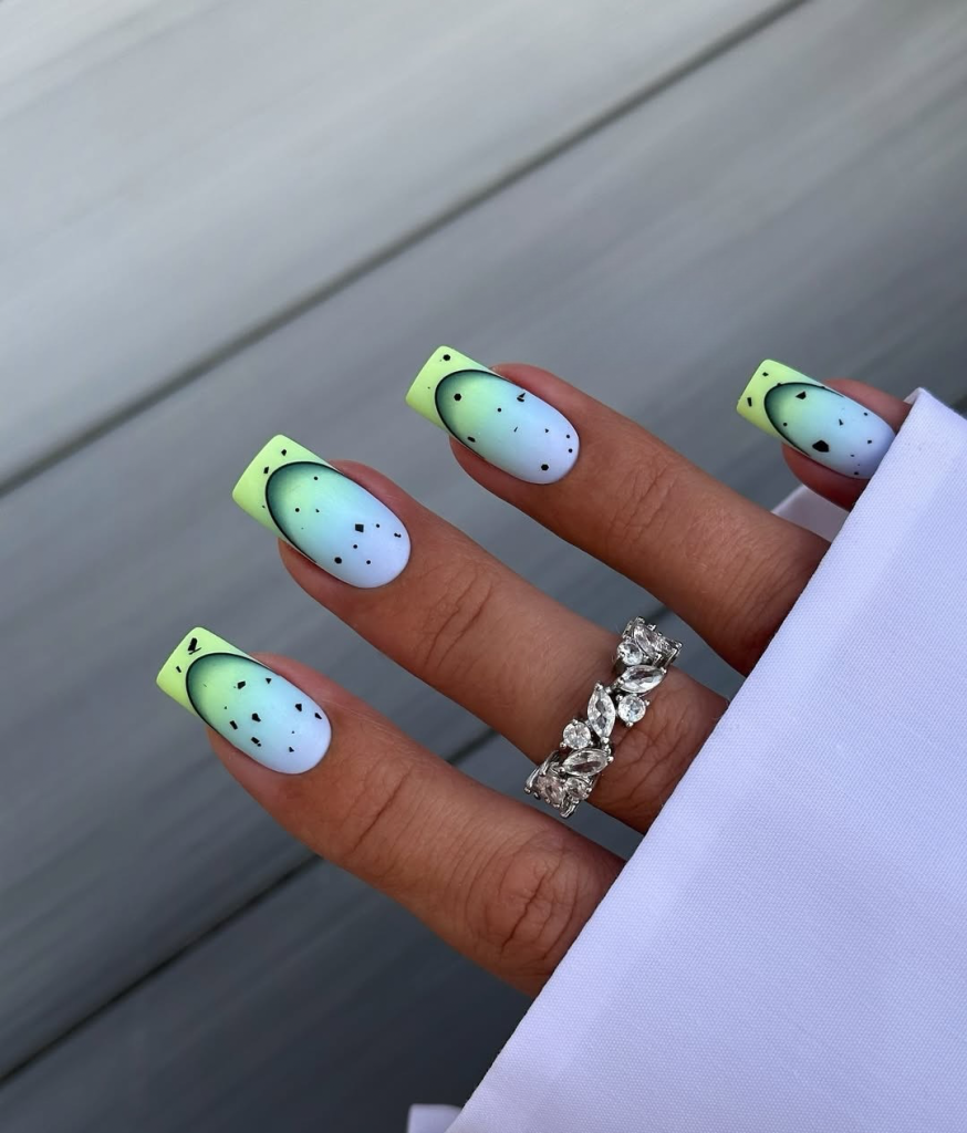 The appearance of such nails resembles those which are created on neon art – the tones range between lime green and ice blue, with speckles sprinkled on all of the nails. The contrast of color creates an ombr french effect that is bold, graphic and so very summery. It’s like dipping your fingertips into a watermelon slushie.
