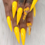 This is just like sunshine in a bottle, the kind that can be used in a manicure. These almond-shaped pink nails have yellow cream tips on them and an acrylic adorned with a gem on the accent nail to give you a little glitz. The whole mood is modern and young, with a touch of sweet girly-ness–a lemonade with a twist of fanciness.