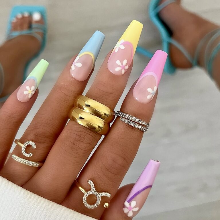 This delightful floral set encapsulates the warmth of the sun at your fingertips. Each finger of the long coffin-shaped nails is painted in a different soft color-yellow, baby blue, lilac, pink, and mint green-with white daisies at the base for a splash of cuteness. The edge of the bright colors and the almost completely nude base give a glossy and gel-like finish while the designs can overshadow everything. This design is a very good 2025 choice for those who want to be feminine, colorful, and minimalistic but also make a statement. Whether you wear nails acrylic long or short the nails sprinkler water on the joy of the season with this cute mixture.