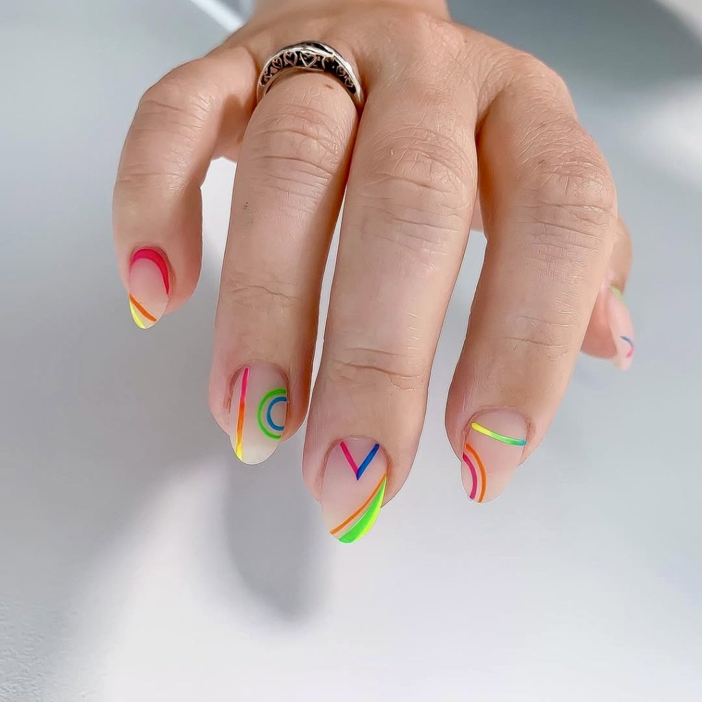 This cutting-edge accessory is absolutely ideal for those who want to eschew a lot of decorative objects yet enjoy a small ones. Each short nail features a nude base that is complemented by clean, linear swirls in highlighter hues—neon pink, lime, green, cobalt blue, and sunshine yellow. The technique of using only simple forms for the design is a reference to abstract art, which is achieved without compromising chic and polished aesthetics. The square shape of the nails brings an edgy design, contributing to a sharp, modern look. They can be matched with almost anything, especially by women who prefer to wear statement outfits without looking overburdened. This design suits short gel or acrylic nails in addition to denim or streetwear clothes. Definitely, the idea you have to try is a combination of minimalist and bright designs.