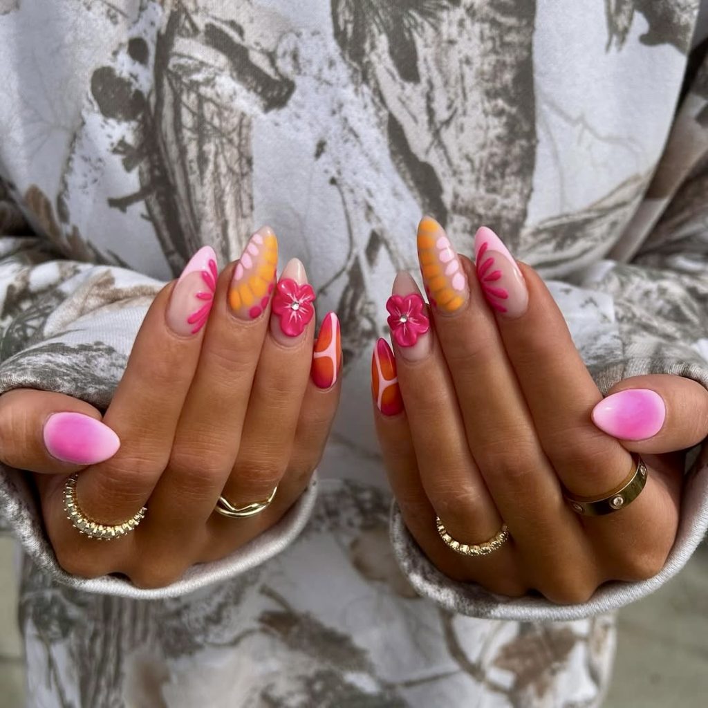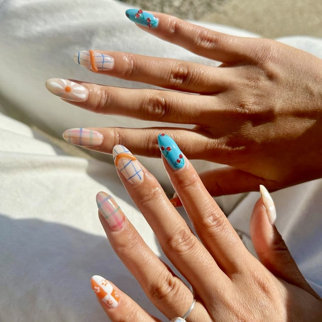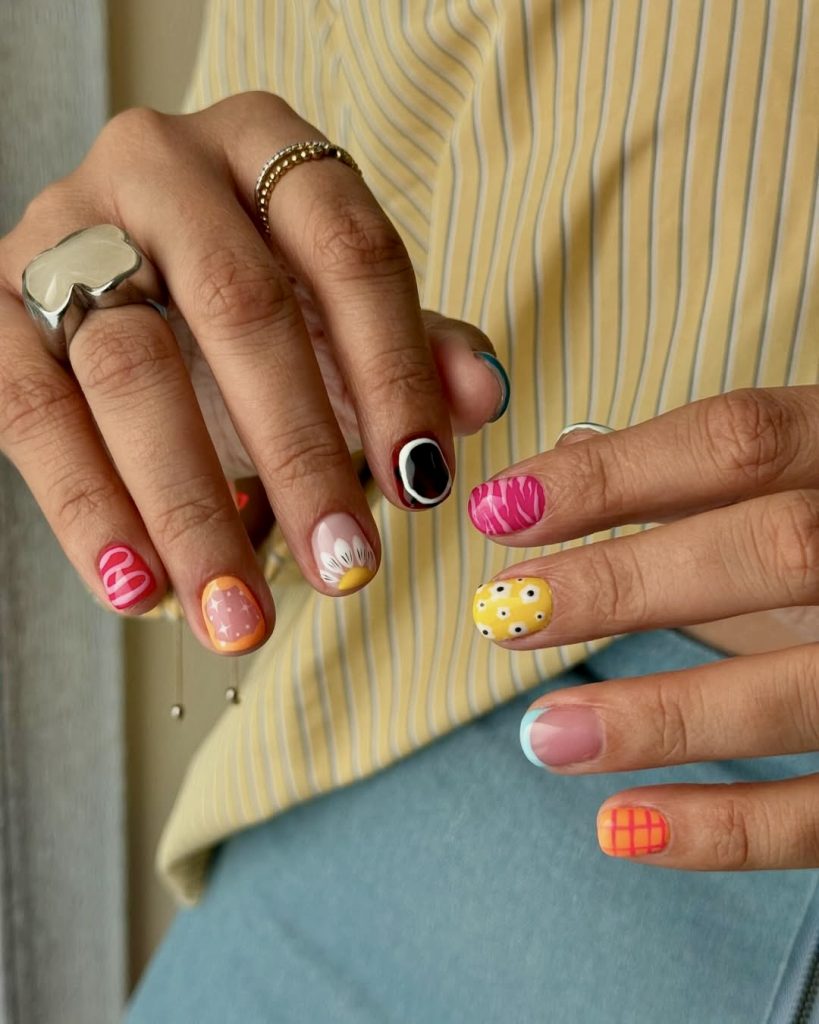Nothing can be as good as the summer joy that one feels when there is a full bloom of rainbow florals. This daring gel-like manicure that seems like a jellybean integrates all the colors of summer—hot pink, turquoise, sunshine yellow, red, and tangerine—on short, round nails. Each design is an individual painting of large and cartoonish flower images, which gives a feel of the retro garden. The nail set will perfectly match your closet if it consists of statement rings, bright accessories, or mixed patterns. It is one of the most colorful combinations of the year, and it’s a must for the strong women who want to be different in 2025.