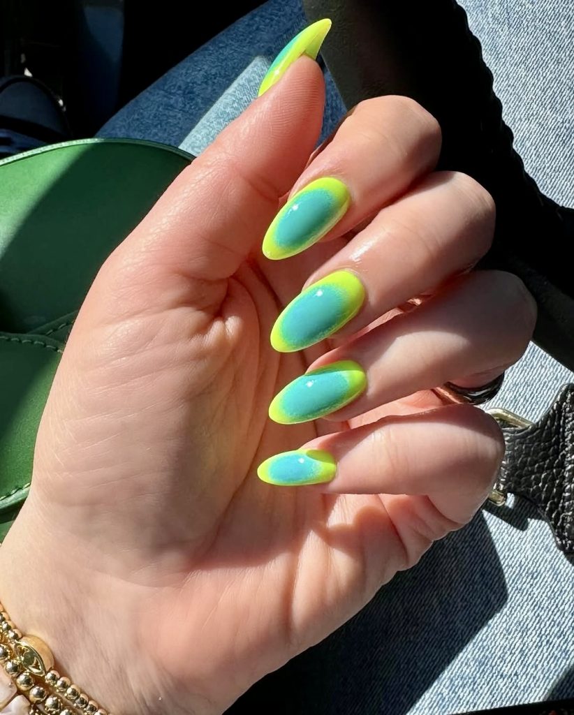 The eye-catching ombre style with a blend of bright lime and electric turquoise that is sawming summer 2025 declares one’s ownership is the must-have in offbeat summer designs. The visual of a nifty, glowing aura in each finger is created with the help of the almond nail shape, cherry, glossy finish(colors increase their light further in). If you are searching for something that is both sharp and elegant this neon decor is perfect. It’s the best option for ladies who want to express their uniqueness in the same way by wearing sneakers, jeans, or high heels and dresses. Nails with this design are usually made using gel or acrylic, most suitable to wear through summer heat and during traveling.