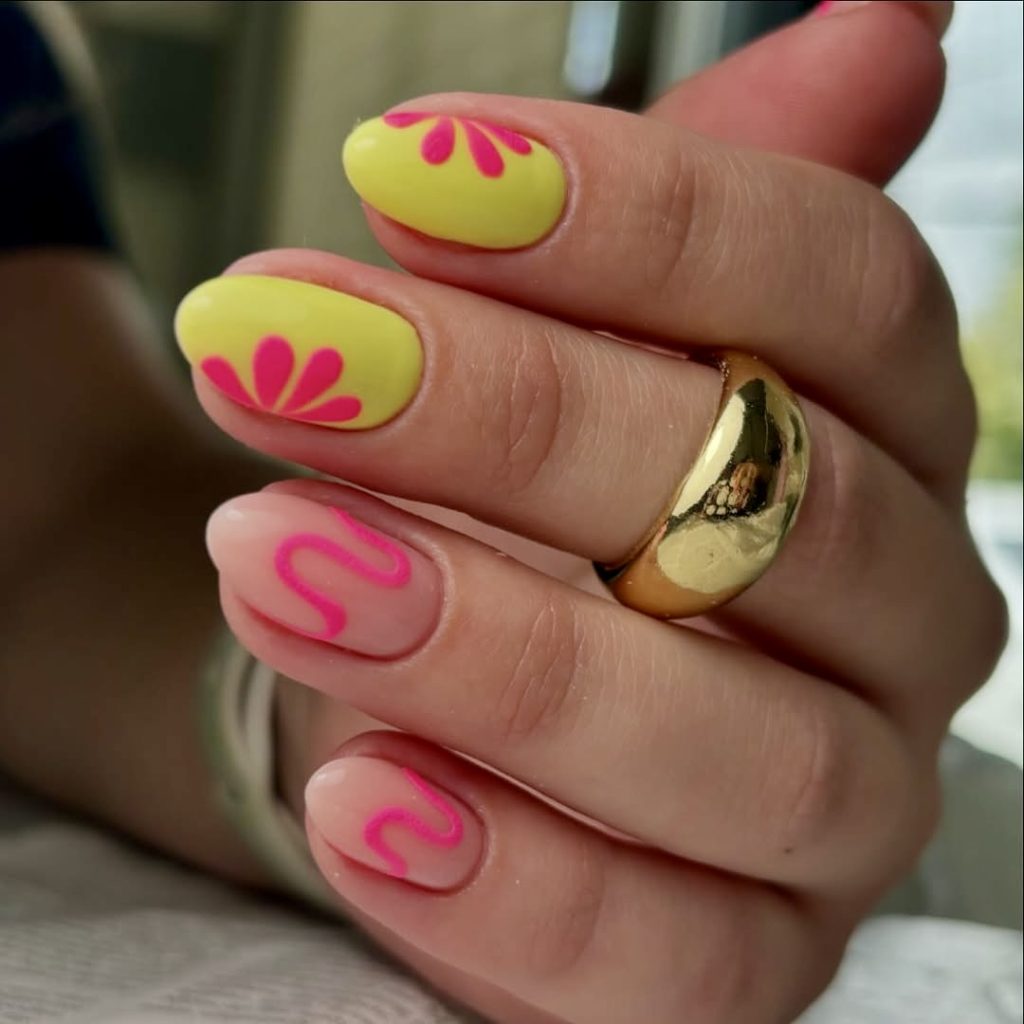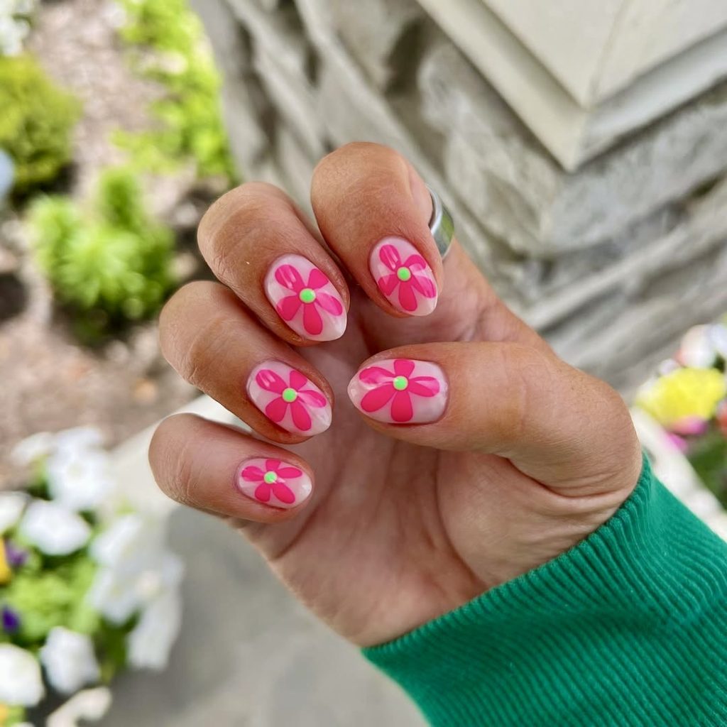 This cute floral set isn’t at all subtle, and that’s precisely the reason why it’s so alluring. Giant fuchsia petals with lime-green middle parts depict a daring image on each short, round nail. The plain nude base makes it possible for the giant designs to stand out, therefore, it is a notable but wearable option. These nails are essentially yearning to be displayed at summer BBQs, patio brunches, or flower market strolls. It would be a perfect pick for people who want to see simple but impressive designs that exude joy and character. Besides, kids and adults both can easily duplicate them, particularly when they use dip or gel techniques for a silky smooth finish.