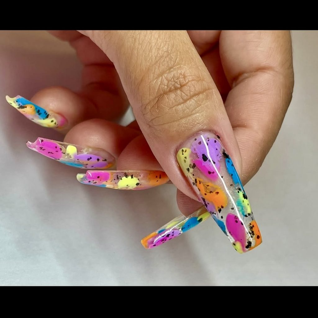 If you are a fan of abstract art, this vibrant splatter art on your nails will make your nails look like they are in an art gallery. The splashes of fluorescent colors in bright pink, blue, yellow, orange, and purple on a clear acrylic base collide with black ink-like specks for a feel of a free painter. The long length and square shape of the nails are the exaggerated features that give an extra dose of attitude. They are, thereby, totally suitable for fashionistas who love to wear things that are beyond the traditional. This, of course, is not just a creative event look but also great to wear for your nails to be the chief decoration of your outfit, the gallery explains. It is also the very right choice because the trend of color combo of designs is on the upswing in 2025.