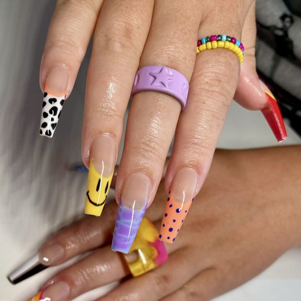 If maximalism is the essence of your summer mood, these long, square nails are the absolute thing you have been wishing for. The surface of each nail is designed with a completely different style: animal print, smiley faces, purple gradients, and neon dots, all painted on a nude base for balance. The highly prolonged length thus is the illusion of art made out of each finger. This set is for the main time for the bold dressers and the creatives who can not dowithout 3D and bright colors. It is also the style 2025 that most people are looking for since you can use it for different patterns. It should be worn with a lot of color rings, statement jewelry, and summer festival attire.
