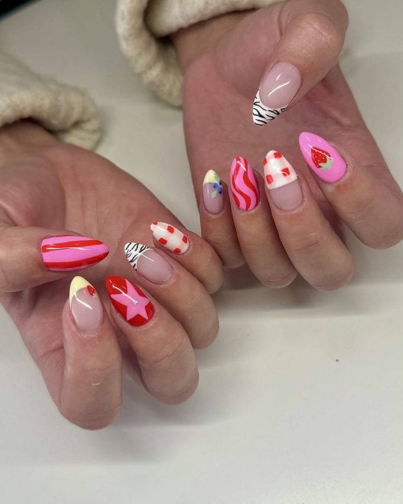 This attractive idea, in a sandwich of strawberry prints, swirls, checkerboards, and colorful accents zebra, is the ideally fun thing. The vivid red and bubblegum pink colors combined with soft yellow and zebra patterns create it an image of an amazing yet wear it easy set, just the thing for summer activities. The dings are of the medium almond shape that is potently practical, allowing for some decorations and design at the same time. These designs are simply for women who want to wear something fierce and yet integrated, the only reason you should be a retro prints and textures mixing in clothes mode fan. It is a fun and fresh way of doing things, signature move for the year 2025.