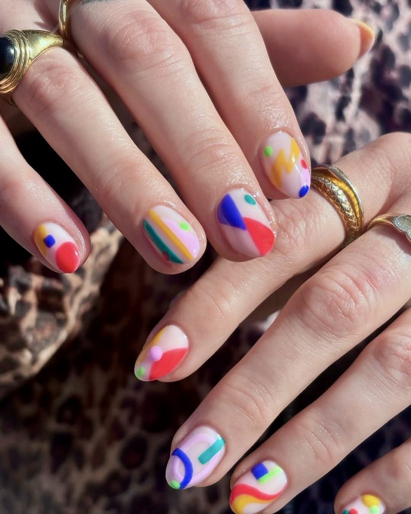 This is an abstract nail set in the style of playful art with a graphic twist that speaks to the Bauhaus concept and beach day. The use of solid colors red, yellow, blue, and green against a cold base makes each short nail a miniature canvas for elements, patterns, and motion. The effect is so classic DIY but at the same time, it is carefully done enough to wear to brunch or work in a creative office. This design is perfect for colorful design fans who wish to have something expressive but at the same time neat. It is an easy choice either to do at home with the help of gel polish or at the salon if you want the look to stay for the whole summer.