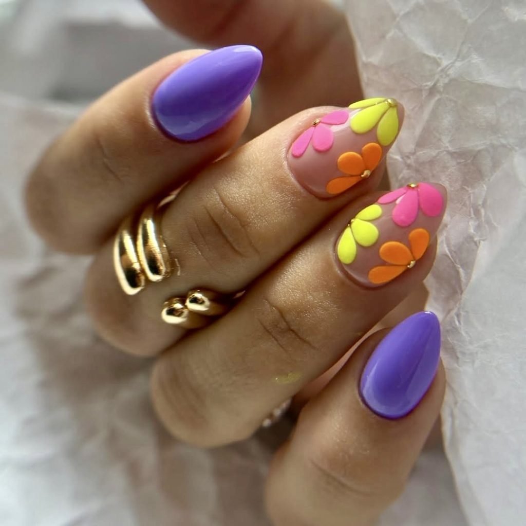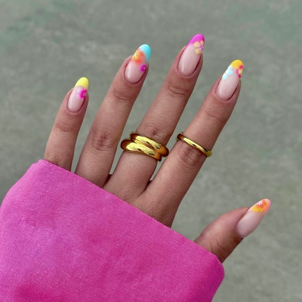The traditional French tips trend that has enjoyed a makeover is YES; this is a must-have to s-t-a-y cool in summer. These color extremes of bright yellow, pink, and sky-blue smoothly transform into tips, while tiny neon daisies bloom along the edges. This almond-shaped nail, which is set on a gel base with a glossy finish, is a perfect blend of fun and chic. It is a style that is perfectly suited to the golden hour selfies, rooftop dinners, and any outfit that asks for extra color. The soft gradient plays with floral designs right in the face and especially it becomes attractive to those who love a real casual-with-no-effort look in 2025.